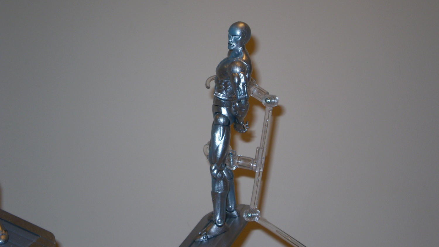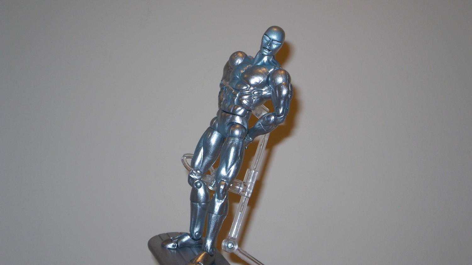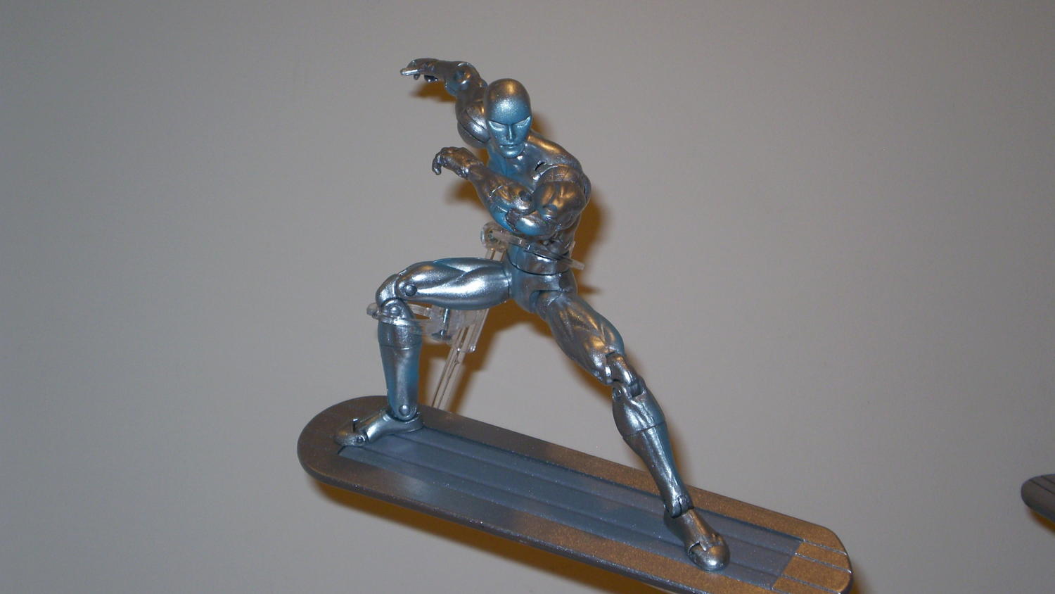 You are more than welcome. I'm glad to have done this as my opinion of Hasbro's Ronan Series Silver Surfer has improved slightly. I still prefer the Toy Biz sculpt, but my criticisms of the Hasbro fig are not as strident. Hasbro Surfer: Pros (opinion) Face - it looks more like what one would expect Surfer to look like given depictions in Annihilation and Annihilators Hands - more utilitarian; could be blasting power cosmic or indicative of maintaining balance in a typical surfing posture Board - Gleaming and reflective Hasbro Surfer: Cons (opinion) Head - pea-sized noggin is out of proportion with body Sculpt - shoulders are narrow giving fig an almost teen-like appearance; trapezius muscles are over pronounced creating strange look Board - very thin offering only one foot peg limiting where Surfer can be placed Toy Biz Surfer: Pros (opinion) Face - features large eyes; the look given to the character by Jack Kirby (intended to make him "obviously" alien looking) Sculpt - many points of articulation creating a wide range of poses Board/Feet - magnets in feet allow Surfer to placed at multiple points on board (portion of the board is a metal strip) Paint - silver paint is accented with blue highlights (pics don't really demonstrate this); paint has metallic flecks (can be seen on some pics - my camera and camera-skills are both lacking Ha!) Toy Biz Surfer: Cons (opinion) Face - some may not like Surfer's bug-eyes Sculpt - shoulders look a little wonky when arms are resting at sides due to additional shoulder hinge articulation Hands - hand with index finger extended is silly looking Board - clunky looking when held at Surfer's side |