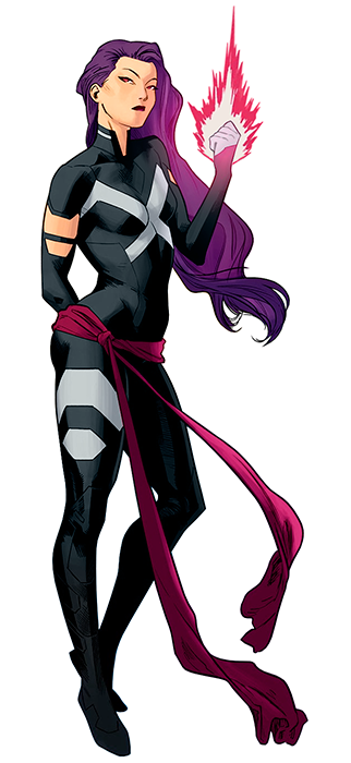 My guess for Psylocke would be an updated X-Force figure from the SDCC set or her Marvel Now look. A lot of characters with specific costumes show up on Contest of Champions and the Marvel Now look is close to what she has in the game.