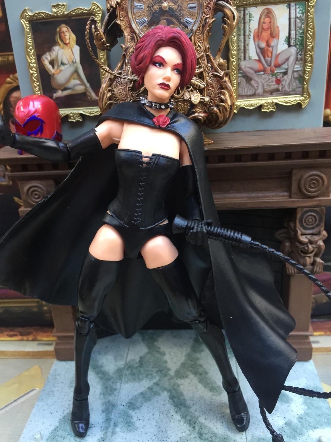 It's an absolute pleasure. I knew you were waiting. I couldn't find any decent pics online. And if I can I will help you find a set if they come to the UK earlier. Please don't spend too much money. I only pay package and taxes, but my friend got it for me. It is a dream come true for this old fan. Now Selene. I like the head. Her eyebrows on mine are a bit close ala Frida Kahlo, but I still love her. I kind of prefer her on the Emma body. The eyeshadow on both Queens it's a bit prostitute, but it kind of fits the theme. No way this two would be on general release. With Selene I tried the Satana cloak, but her hair makes her head pop off. I decided to take the silly shoulder pads off Emmas body. I like it just fine. Selene has had lots of dark outfits. Not often she wore the Black Queen outfit so it feels fine, almost as if the guys at Hasbro thought about it before. I wonder. Anyway, if the set comes on pre-order in UK before I will get you a set. Heh. I can't believe the decimation my wishlist has gone through over the last four years. I'm THIS close to Count Nefaria being my #1 wanted figure.