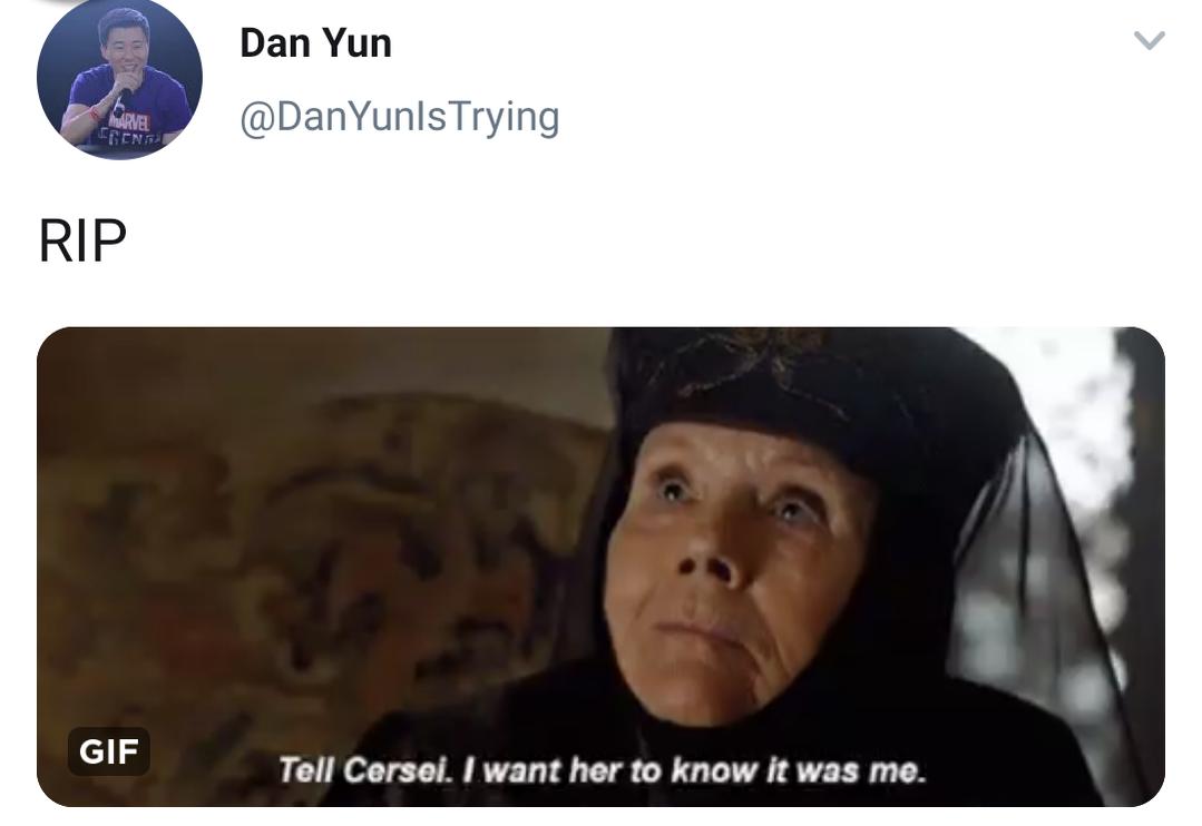 That's pretty unfortunate regarding Diana Rigg. She is/was one of my favorite characters from GoT. I also liked her from The Avengers. I remember being a young kid thumbing through the TV-Guide (lol age tell) and happening on a listing for this old (syndicated) Brit TV programming. I stayed up late (woke up early) just to watch the show only to learn that it was a UK espionage serial, not the live action superhero-show I was hoping to see. I became a fan of the show despite my initial disappointment because of her considerable beauty, obvious charm, and the fact that she reminded my childhood self of Black Widow (in looks, if not mannerisms) which was good enough in concert with the other considerations.