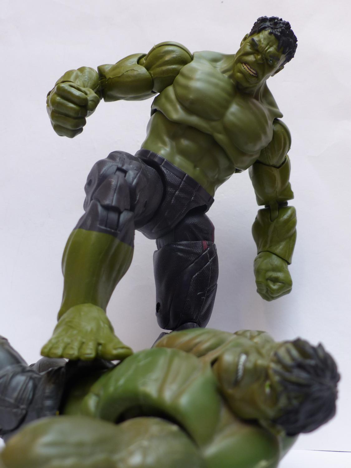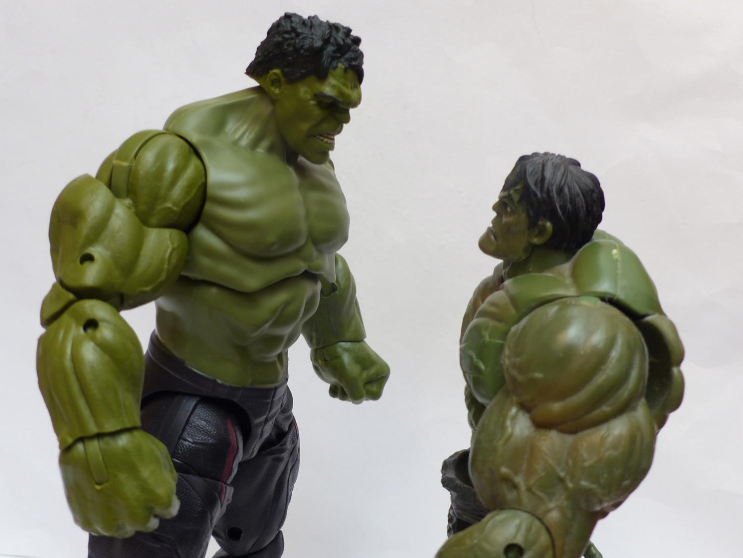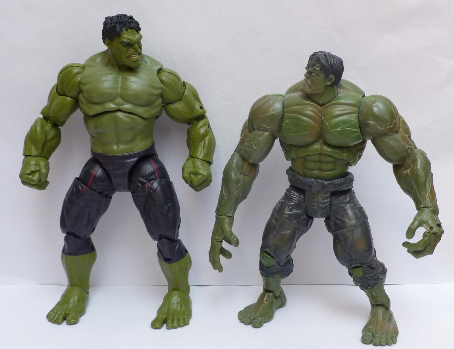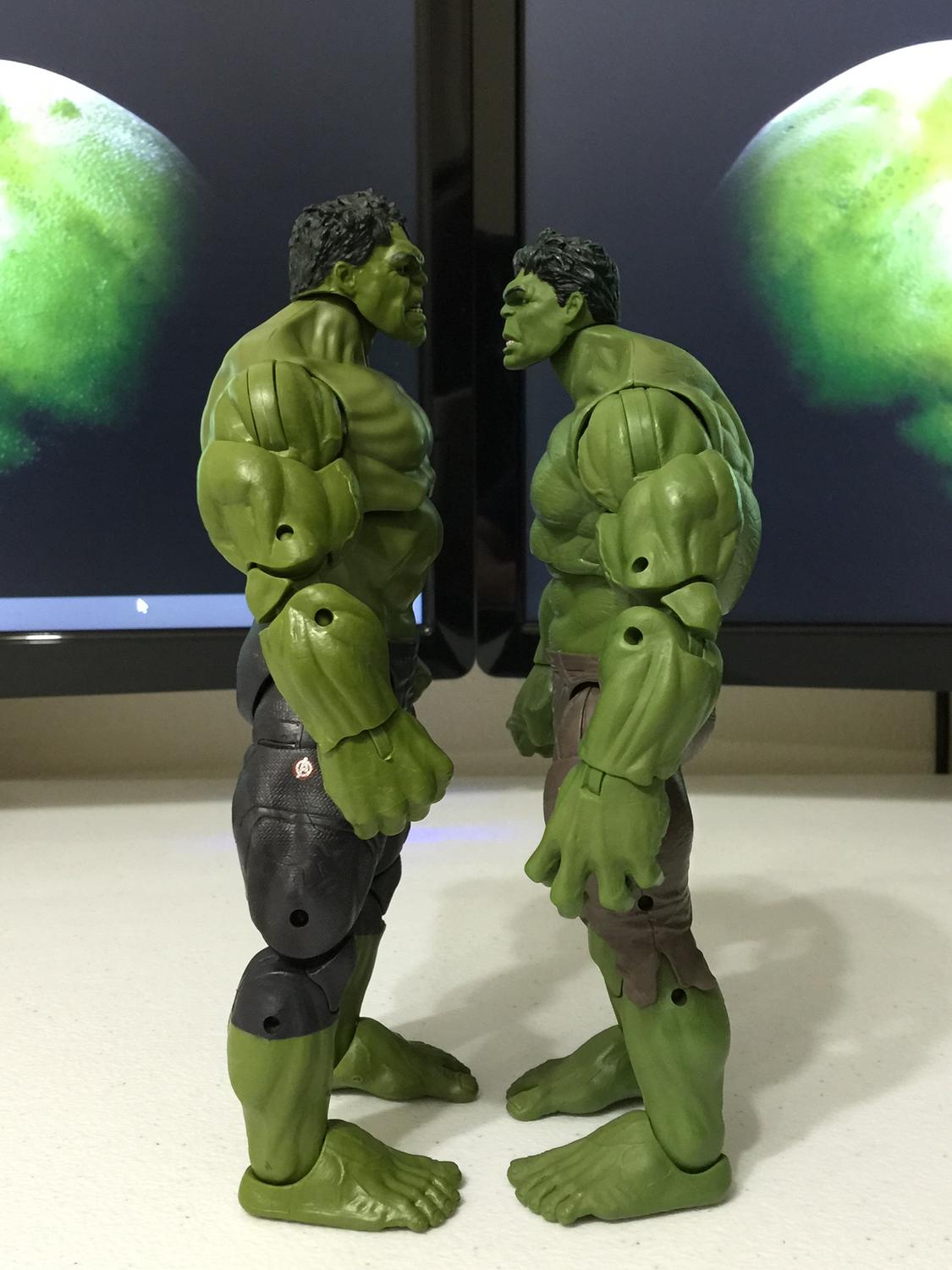Wow! I am very impressed with both of these Hulk Figures. On the left of your screen we have the new BAF ML Avengers 6' Hulk and on the right is the older Walmart Exclusive Avengers Movie Masters 6' Hulk. The ML one is a little bit taller, is wearing the Avengers uniform pants and with two fists he is ready to SMASH. The MM one has a much more defined and muscular back, is wearing the classic torn pants and has his left hand open ready to CRUSH. I really love both of these figures!