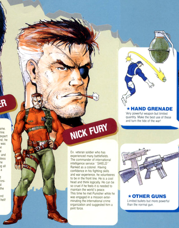 EXCELLENT Kirbyish Nick Fury custom! I'm unfamiliar with any video game version of Nick, but your custom is exceptionally nice. A cross between Jack's initial "007" Fury & Steranko's latter day Nick.