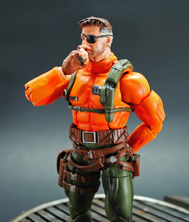 He's the director of SHIELD but this time he's teamed up with the Punisher for some vigilante justice, it's Nick Fury! The 1993 Punisher Arcade Game featured Nick as the player 2 character and here I created him in Marvel Legends form to scale alongside your Punisher from the retro/vintage card series of ML. Nick Fury uses the same Punisher body, modded Nick Fury head/webgear, and medium body feet. Demo man's belt/leg holster were used and various details sculpted using Aves apoxie sculpt. I originally painted his sweater a mottled brown color to match the game sprite but found the original Japanese game art depicting him in a much better looking orange and went with that, airbrushing the entire figure with shading and highlights. Add a stogie like he smokes through the entire game, even while fighting, and Nick fury was ready to fight alongside the Punisher!