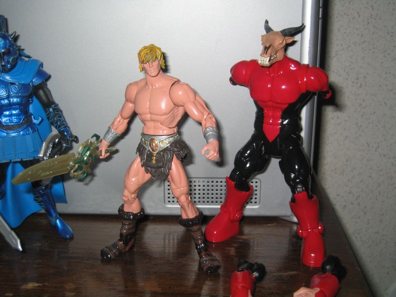 He-Man's Recipe is: Head 200X He-Man; boots modified 200X He-Man; biceps Ares; forearms Jemm, hands and upper part of shins wave 7 Blue Beetle; torso, waist, upper legs OMAC.