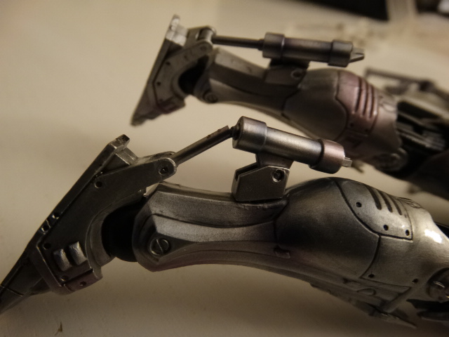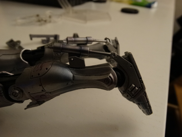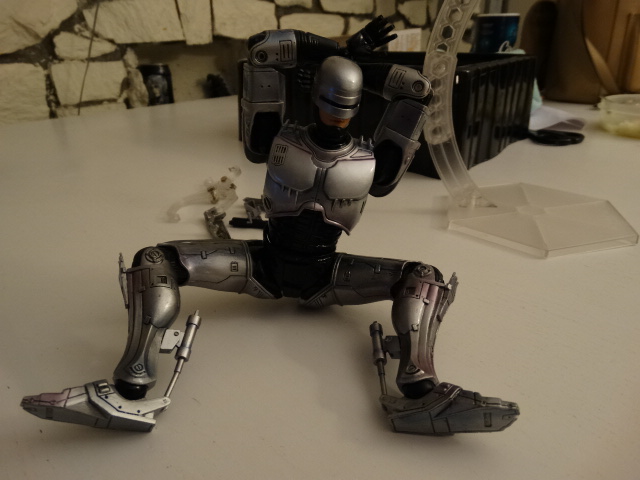 Legs are ok, but since it's Robocop we don't need to do some hi-kicks though If you have a chair on scale, you can seat him normally, wich is great. One of the best details, wich is also the biggest flaw, is the movie-accurate ankle articulation. The pipes are sliding in one another wich is great... but it means that you can't move the feet laterally, meaning no dynamic poses with slightly spreaded legs. Also be careful while moving the ankles as the smaller part entering the pipe is very fragile. I almost broke mine ![]() You can detach the front part of the right tigh and putting optional parts to re-create the gunrack gimmick The gunrack assembled "Dad, can you do that?" Overall, I'd say it's a very nice display piece with great details, but don't hope for as much posing possibilities as you have with the other PAKs.