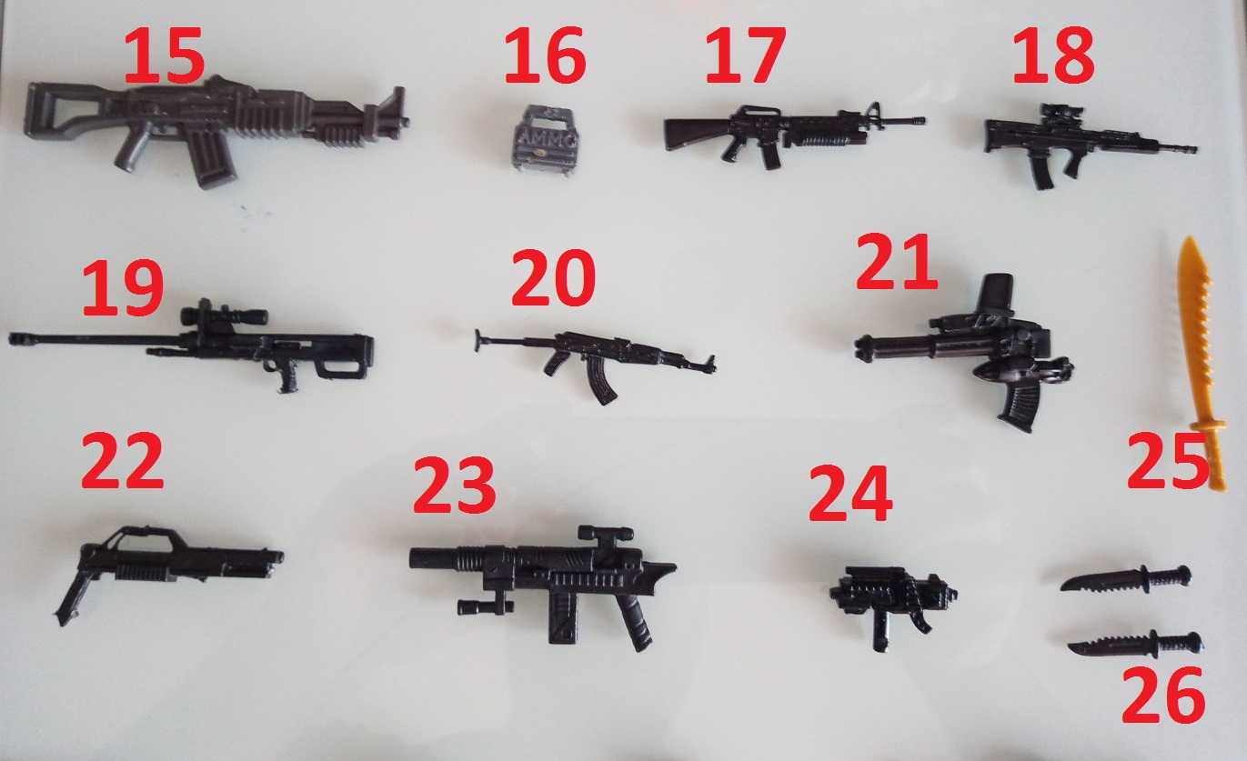 09: GI JOE Armor Tech Heavy Duty or Battle Corps Backblast 16: Looks like Action Force. 19: GI JOE 2006 Lowlight 22. I've seen this before...you've posted these before. That's a cut down GI JOE Sonic Fighter Dodger gun |