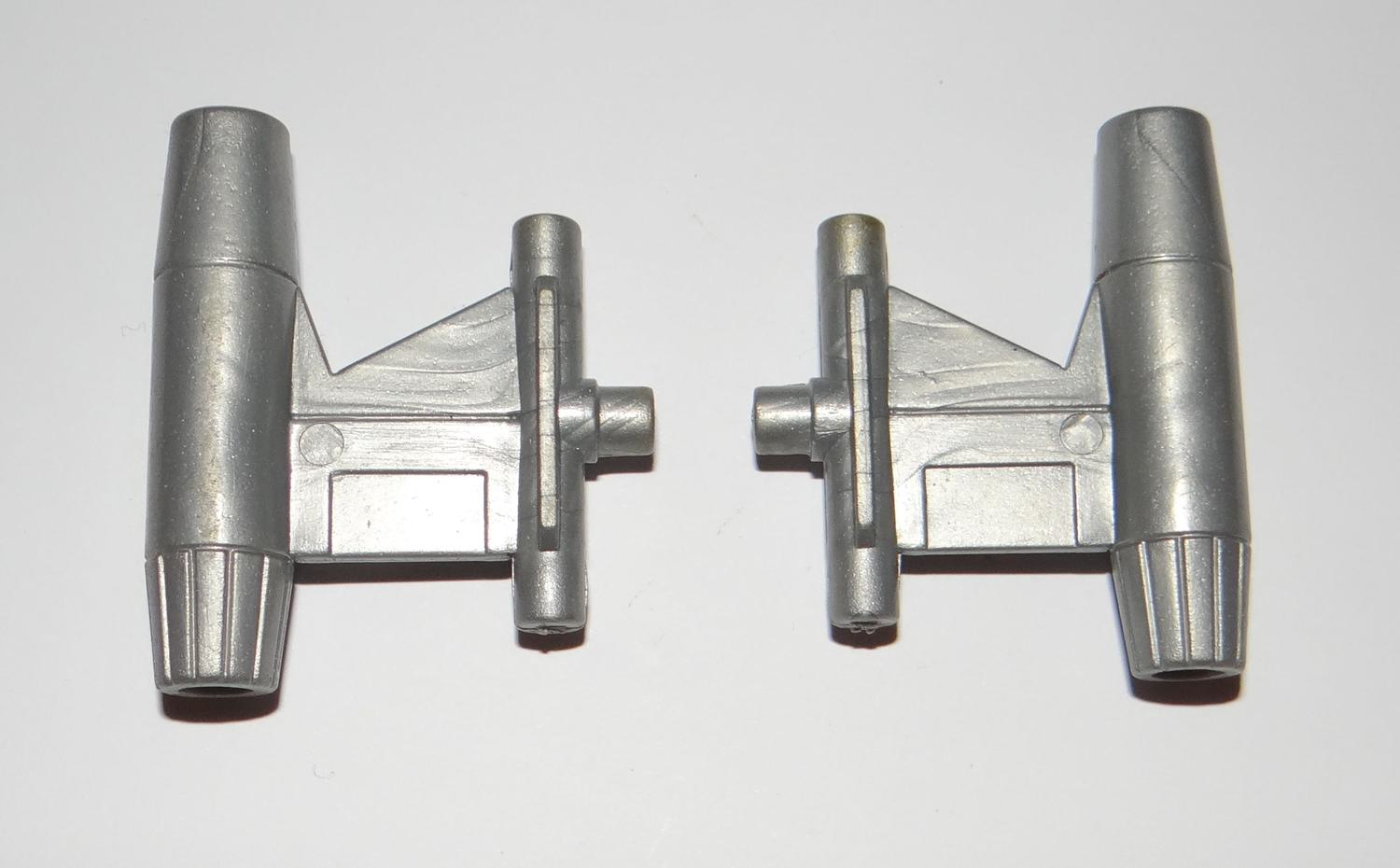 Here's another group of unknown vintage parts, any help is greatly appreciated! Photo 1: Chrome clip on missile, under 2" long Photo 2 & 3: Clip on gun, under 2" long. Transformers? Photo 4: Black Fist Projectile, large hole. Same size as G1 Ultra Magnus Fist Photo 5: Silver Staff, almost 3" long Photo 6: Larger size Sai that folds. Modern TMNT? Photo 7: Pair of G1 Scale Tail Fins with Boosters Photo 8 & 9: Black Battery Cover, Approx 3" Tall Photo 10: 2" Long green cannon with silver metal post |
