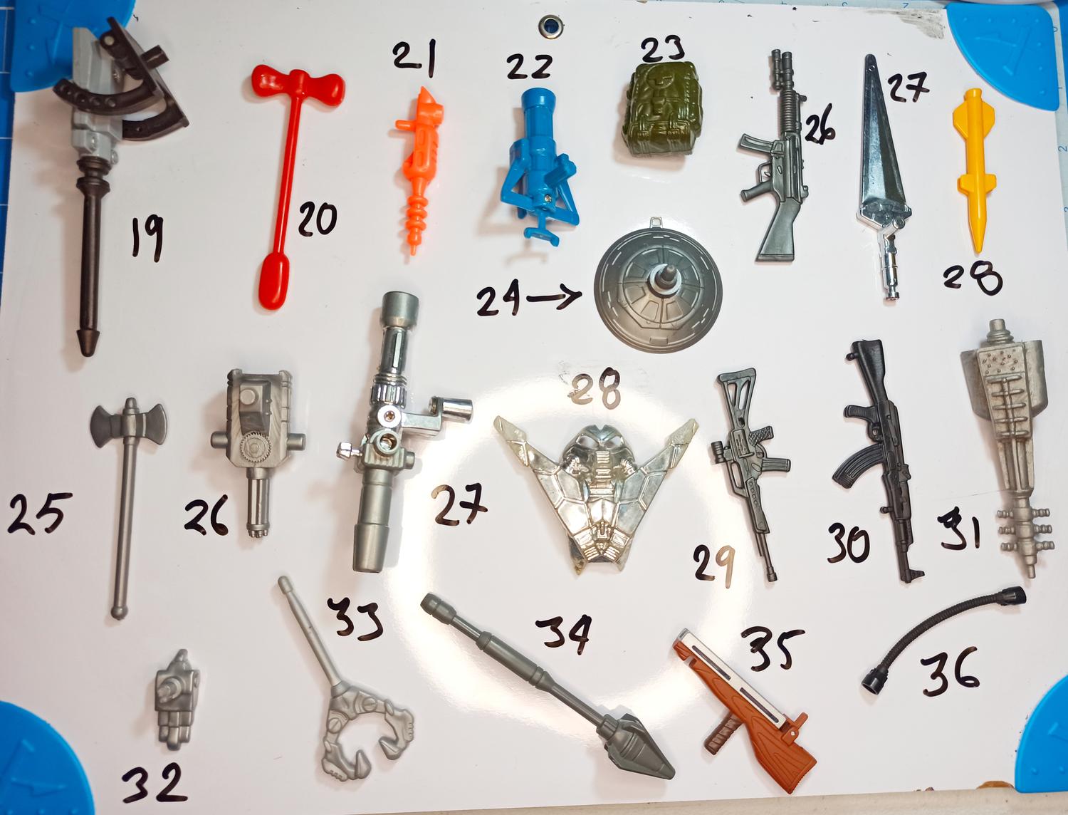 16. Super Natuarals Vamp-Pa 28. GI JOE ARAH Persuader [Yellow 28, you have two] 36. Lego usually space theme |