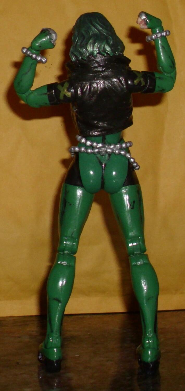 I bought an Outback Rogue with a Polaris head (Emma Dumont from The Gifted) & customized it to look less like Rogue. It's neither TV nor comics accurate. Lorna Dane's choker is scrap leather with impasto studs & a cardboard brooch. Her necklace is a bracelet I snipped off Leatherface. I affixed metal strips (made of cardboard) across her knuckles as if she’d permanently bent spoons around them for pugilism. Her bracelets & belt were made from beaded keychains. I glued the plastic disc-release button from an old CD case onto the clasp for a belt buckle. The utility belt she came with was broken in thigh pouches with laminated cardstock straps. Since each thigh bandolier had a gap between pouches, I made her a pair of throwing stilettos from the same material as the straps. Their sheathes were made from a quilted Chinese restaurant napkin so they have a leathery texture. Her heels are four layers of cardboard glued together & spackled over. I made Polaris a pair of magnetic energy effects from twist ties covered in hot glue.