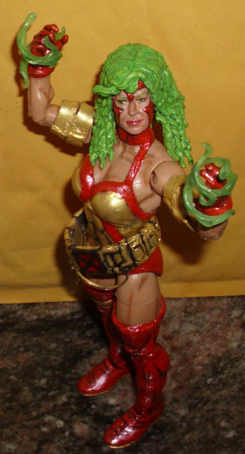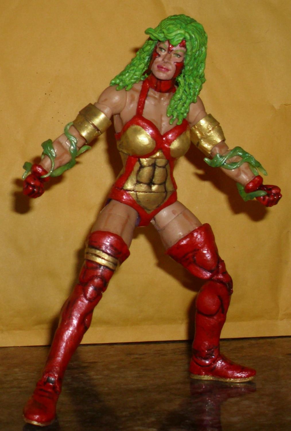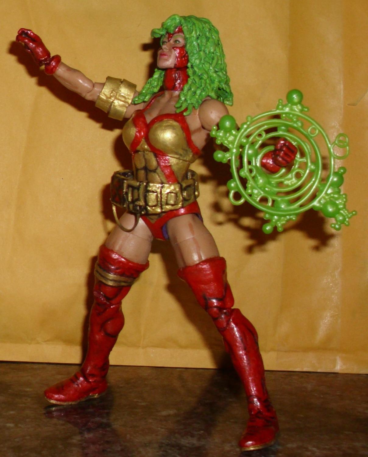 Presuming that there was minimal chance it’d be an official Marvel Legends, I decided to finally customize my own red & gold Polaris. I wanted to convey that she was drawn more chiseled in her X-Factor days. I went looking for a base body whose arms, chest, & thighs were cast in flesh tone plastic in addition to having significant muscular definition. My original plans fell through, by I improvised with a Wrestlemania Chyna.