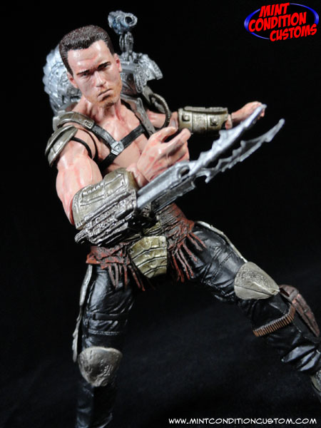 The design for Predator Armor Dutch was inspired by a mix of the old Kenner toys, and my desire to see Dutch show up again in another Predator movie. I thought it would have been cool to see Dutch hunting Predators for the U.S. government. Imagine if Schwarzennegger was in the Predators movie, but in the Laurence Fishburne role of Nolan! That would have been awesome. Predator Armor Dutch is made using a NECA Jungle Encounter Dutch, and a NECA Predator, of course. I stripped off all the armor and weapons from the Predator, and basically attached them to Dutch. I used the two pack Dutch, which was all bloodied, so I had to completely repaint him to clean him up. I had to do some major dremeling to the Predator wrist gauntlets, and to Dutch's forearms, to get them to slip on. I had to dremel some of Dutch's side to get the armor to fit right as well. I glued all the armor down, and even attached a net launcher from a NECA Predator 2 figure. So now that Dutch is utilizing all the weapons and armor of his greatest enemy, he's ready to hunt down every last Predator that makes its way to Earth!