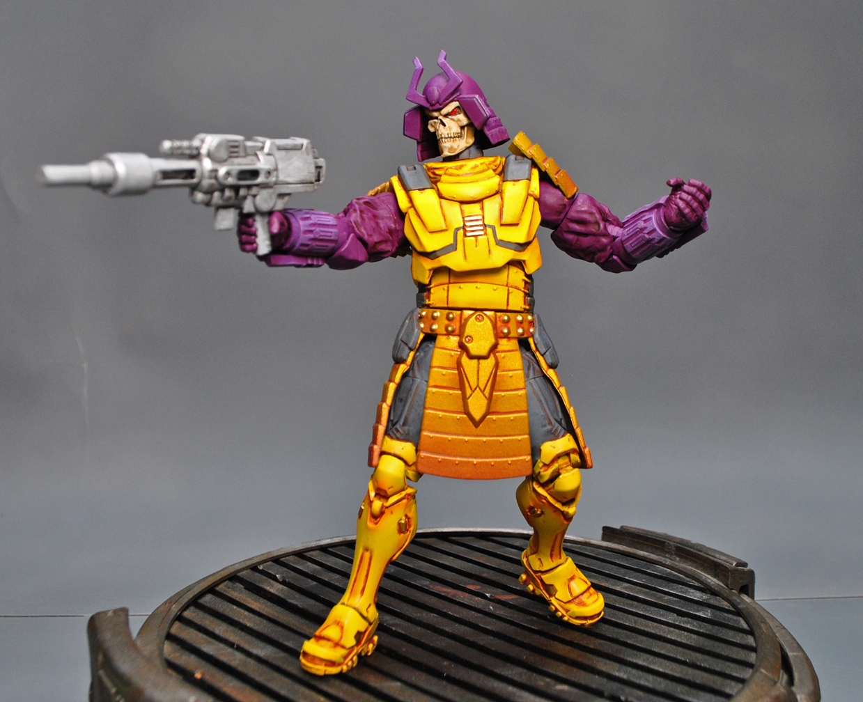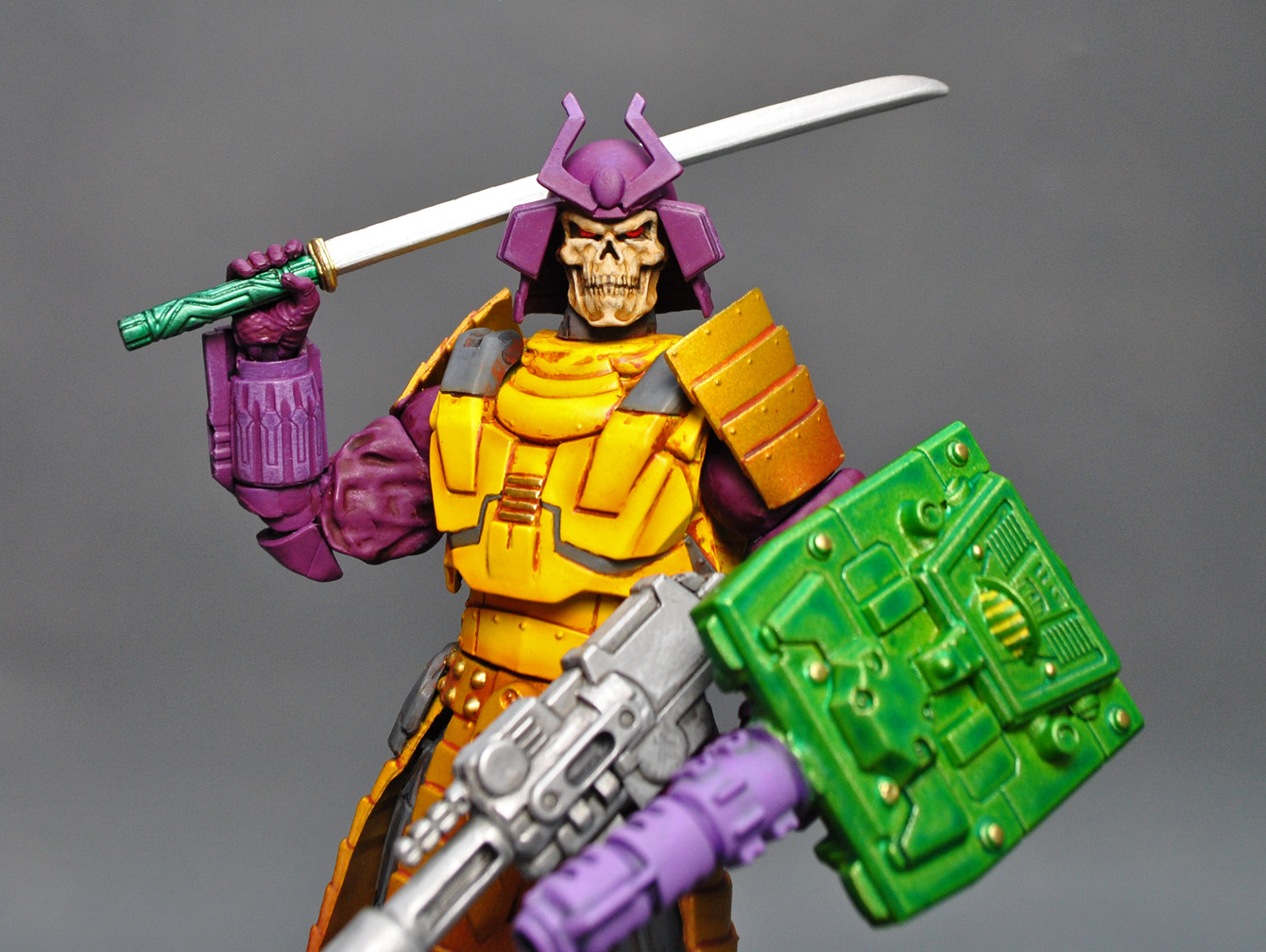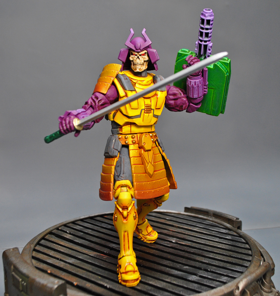 Ready for something really unique? Here's a Transformers/Marvel Legends Crossover Bludgeon! He was created using the Silver Samurai body and heavily modded helmet, Ghost Rider head, War Machine armor/forearms, TF Hoist shoulder for the backpack, Overwatch Reaper legs, KO TF Scrapper top for the shield, and some fodder parts. Bludgeon was primered with Bulldog Adhesion Promoter, sculpted sections using Aves Fixit Sculpt, hand painted, airbrushed metallic armor effects, and sealed with Mr Hobby premium Matte. His eyes are glass reflective and he has a 5mm port in his left arm.
