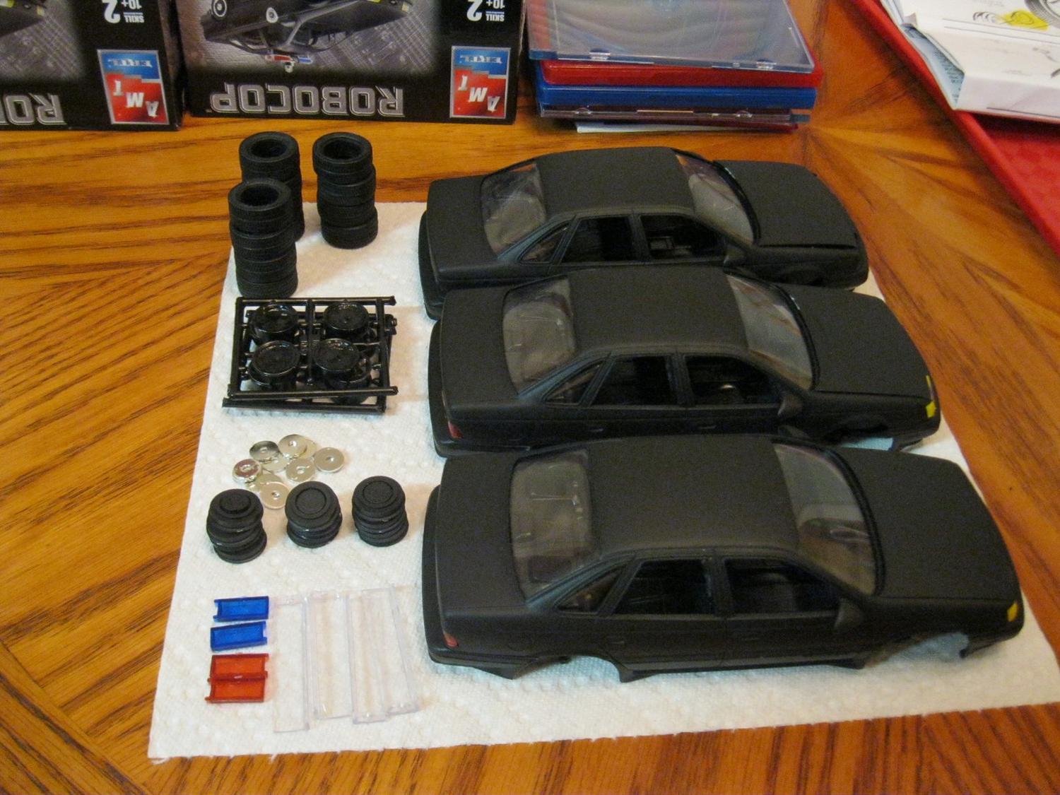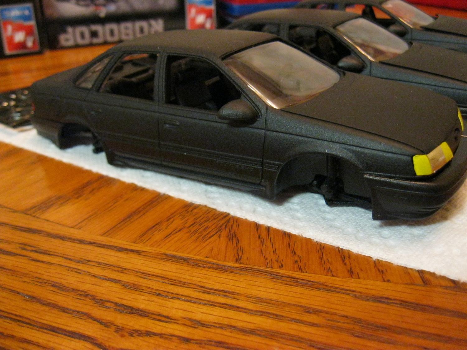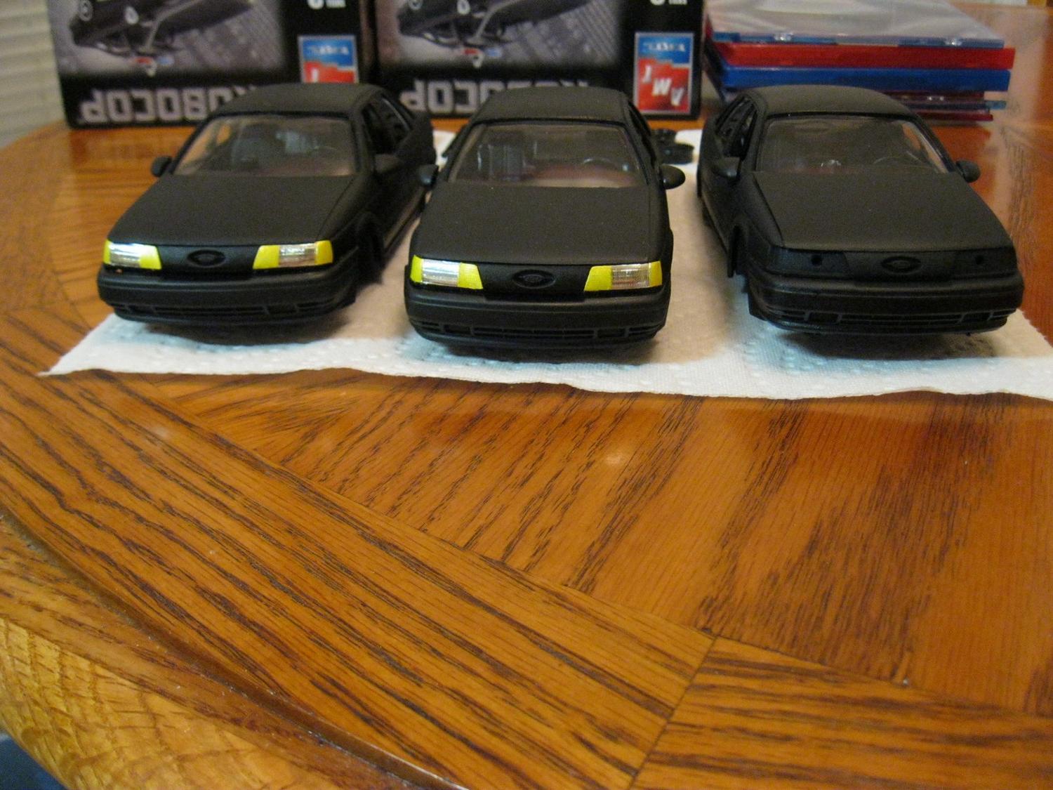 Anyways, as I said, in a fit of randomness and not really having a good day for painting (it's damp outside, so I'd normally not take on a spray project during this kind of weather), I just decided that I'd jump on these. I took out all 3 of the kits I had leftover, a can of Kyrlon Fusion flat blat, and went to town. So far, these are my results: http://www.toyark.com/attachment.php...1&d=1315441313 http://www.toyark.com/attachment.php...1&d=1315441313 http://www.toyark.com/attachment.php...1&d=1315441313 http://www.toyark.com/attachment.php...1&d=1315441313 http://www.toyark.com/attachment.php...1&d=1315441313 http://www.toyark.com/attachment.php...1&d=1315441313 . . . . and you'll see I ran out of paint: I'll be honest, I don't entirely know all of my plans yet for these. As I said, the Ford Taurus SHO was not the model of car used in any of the movies, but this is simply the kit I'm stuck with. I don't really have any plans to de-SHO it, other than maybe removing the "SHO" letters from the rear bumper (i.e., the headlights and brake lights are different between the SHO and other models of Taurus). A part of me wants to make at least one of them "pristine" and "movie accurate", but I'm not sure. What I DO intend to do with one of them is to create one that is from the opening sequence of Robocop 2: http://www.toyark.com/attachment.php...1&d=1315442081 If you've seen the movie, then you'll know what I'm talking about. I've also mulled around the idea of at least replicating the project to put up for sale. Anyways, I thought I'd share this progress with you guys :) Also, just a little bit of personal trivia of ol' SQ7, he used to have not one, but two actual Tauruses (though neither were movie replicas). :D |