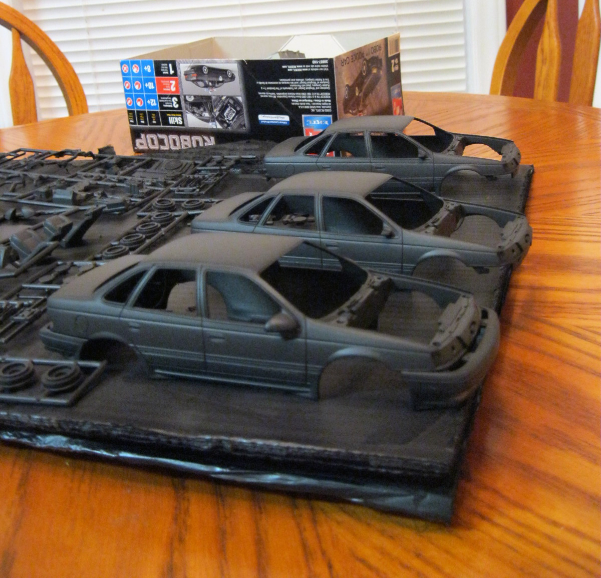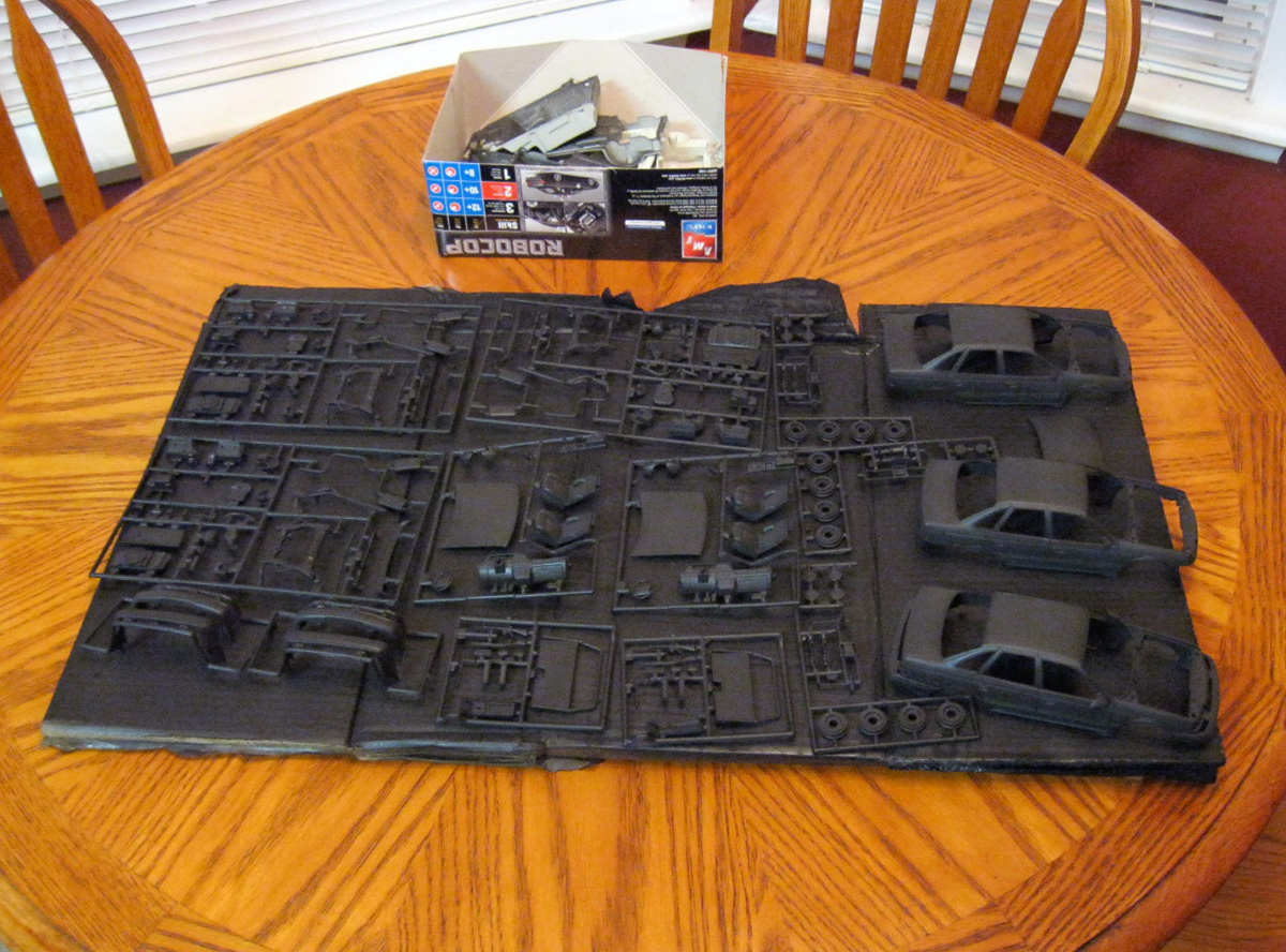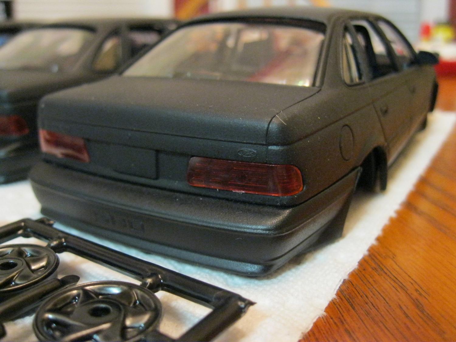 Anyways, as I said, in a fit of randomness and not really having a good day for painting (it's damp outside, so I'd normally not take on a spray project during this kind of weather), I just decided that I'd jump on these. I took out all 3 of the kits I had leftover, a can of Kyrlon Fusion flat blat, and went to town. So far, these are my results: http://www.toyark.com/attachment.php...1&d=1315441313 http://www.toyark.com/attachment.php...1&d=1315441313 http://www.toyark.com/attachment.php...1&d=1315441313 http://www.toyark.com/attachment.php...1&d=1315441313 http://www.toyark.com/attachment.php...1&d=1315441313 http://www.toyark.com/attachment.php...1&d=1315441313 . . . . and you'll see I ran out of paint: I'll be honest, I don't entirely know all of my plans yet for these. As I said, the Ford Taurus SHO was not the model of car used in any of the movies, but this is simply the kit I'm stuck with. I don't really have any plans to de-SHO it, other than maybe removing the "SHO" letters from the rear bumper (i.e., the headlights and brake lights are different between the SHO and other models of Taurus). A part of me wants to make at least one of them "pristine" and "movie accurate", but I'm not sure. What I DO intend to do with one of them is to create one that is from the opening sequence of Robocop 2: http://www.toyark.com/attachment.php...1&d=1315442081 If you've seen the movie, then you'll know what I'm talking about. I've also mulled around the idea of at least replicating the project to put up for sale. Anyways, I thought I'd share this progress with you guys :) Also, just a little bit of personal trivia of ol' SQ7, he used to have not one, but two actual Tauruses (though neither were movie replicas). :D |