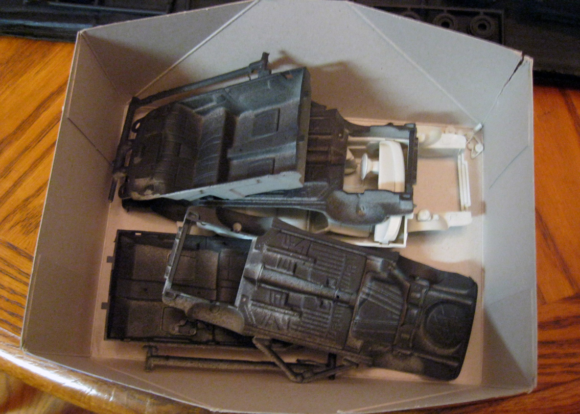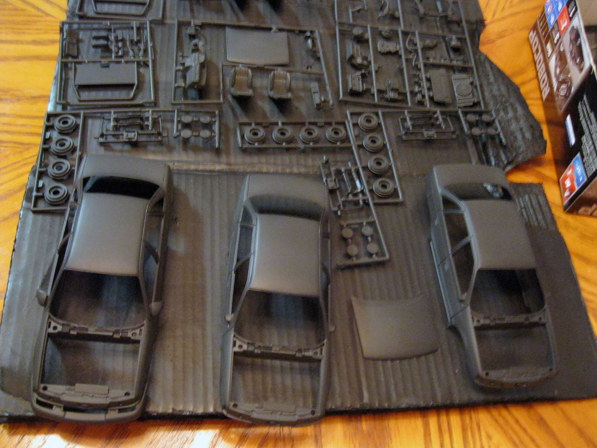The direction I'm going here is that at least one of these cars will look like the blown up car from Robocop 2. I do think I'll end up with at least one looking "pristine". I'm still weighing options. I've got another can of Krylon flat black, so I'm ready to go when I get another decently warm enough day. I'm working on a set of Transformers customs that require one coat of the same and then gloss black. |