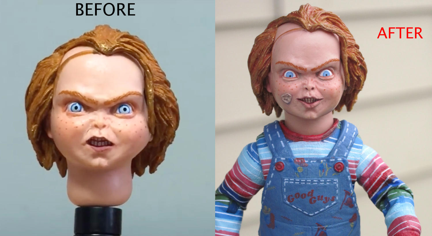 ˚Sculpted/ painted mouth ˚Sculpted/ painted powder burn wound on cheek ˚Shaved-down/ painted eye balls and eye sockets ˚Painted teeth Attachment 47851 Attachment 47852 Attachment 47853 Attachment 47854 Though I do love Neca's "Ultimate Chucky" figure for the most part, I've always felt like the head that depicts his look from the end of the original Child's Play was lacking. I couldn't put my finger on what I didn't like until I poured through photos online. For starters, the facial expression depicted on the head didn't remind me of Chucky. It then occurred to me that every other head that the figure came with depicted a very particular shot from the movies. Examples below: Curse of Chucky Attachment 47855 Child's Play 3 Attachment 47856 Good Guy doll from Part 1 Attachment 47857 The other three heads are all very well-sculpted and depict familiar facial expressions that just look more like Chucky in my opinion. The head they sculpted for part 1 depicts his look from the end of the original Child's Play. You can tell by his receding hair line. I poured through photos and even watched the whole end sequence of the movie, and I can tell you for certain that there isn't any corresponding screen shot from the movie that matches that head. So I thought at one point what they did was basically design their own head based off of the general look from part 1 and improvised a different facial expression... until I found the screen show below. Attachment 47852 It seems to me like they took this screen shot, changed the hair to match the receding hair line look from the ending, took the powder burn wound off the cheek, and changed the smile to a grimace. If you look at his cheeks and eyes on the original sculpt, they almost look like they're smiling, but his mouth awkwardly is frowning. So anyway, I modded the mouth, added the power burn scar, painted his teeth a yellowy color, and shaved down his eye balls. I changed his eyes because for some odd reason, they're bulging out of his head like a pug. I like the way it came out personally, so I thought I'd share. Thanks! |