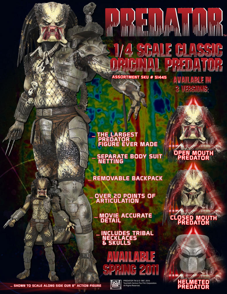 Based on my own accounts, here's the Predator figures I know of so far: McFarlane 2004: CELTIC PREDATOR ELEDER PREDATOR PREDATOR PREDATOR THE HUNTER SCAR PREDATOR NECA 2007: PREDATOR AVP NECA PREDATORS: Series 1 - March 2011 CLASSIC PREDATOR FALCONER PREDATOR BERSERKER PREDATOR Series 2 - March 2011 The Tracker Predator Battle Damaged Classic Predator Unmasked Berserker Predator Series 3 - June 2011 CLASSIC PREDATOR '87 ELEDER PREDATOR PREDATOR HOUND Series 4 - Dec 2011 CITY HUNTER PREDATOR SHAMAN PREDATOR BOAR PREDATOR PREDATOR 2-pk (TRU) Berserker Pred (holo) & City Hunter Pred |