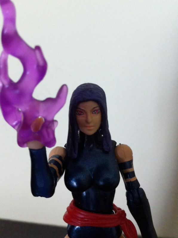 I switched out her head with a Cheetara from Thundarcats line -modified by cutting off the ears - painted to match skin tone of her body The Hair is from a X-23 - painted purple I think it gives her a more Asian look to her. |