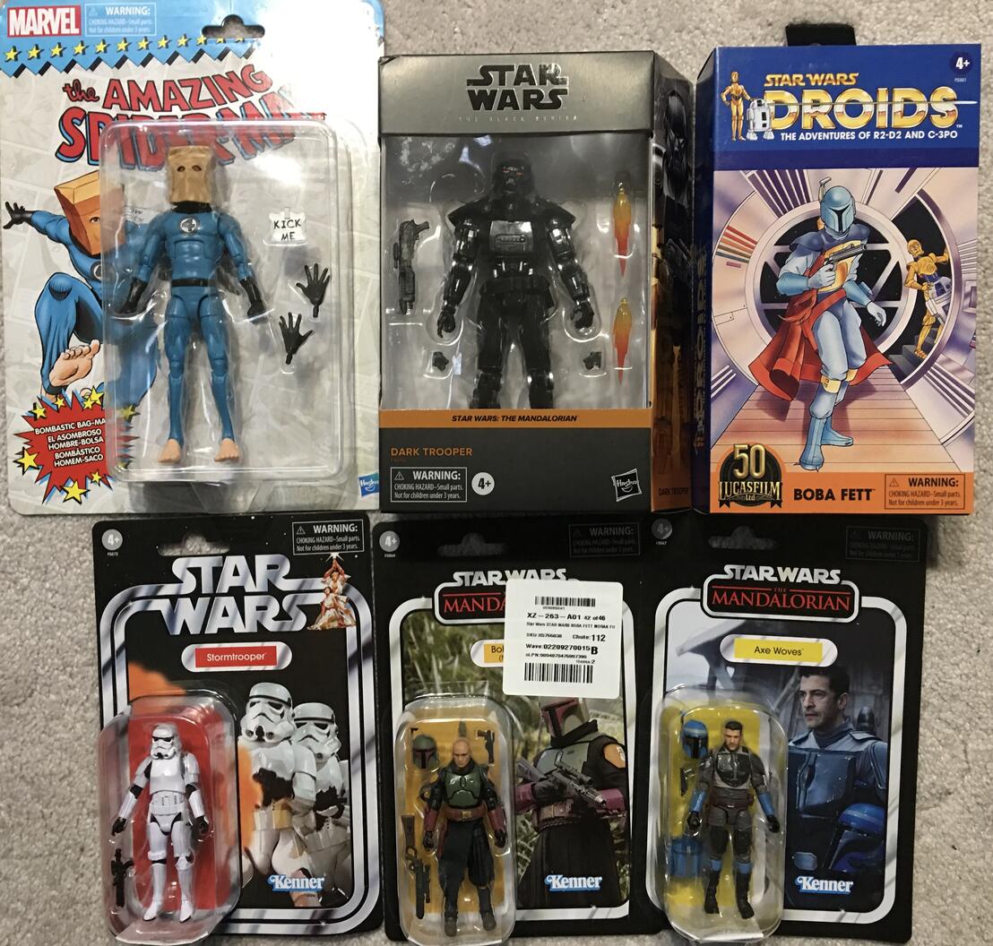 https://i.imgur.com/JfkjCY4.jpg I haven’t taken any pics of hauls in a bit but over the last couple of weeks, I’ve picked up: Marvel Legends Iron Man, Viper, and Thor from the Controller wave. Venom/Knull 2 pack Doc Ock/Silk 2 pack 60th Ann. Iron Spider Peter/Ned 2 pack Black Series Dark Trooper Obi Wan (D+) Fifth Brother TVC Darth Vader (Obi Wan) Boba Fett (BoBF) Blue Arc Trooper (2D Clone Wars) Stormtrooper Heavy Gunner Hammond Collection Triceratops TF Legacy Tarantulas Neca The Last of Us Part II Joel and Ellie 2 pack DC Multiverse Gold Label Kyle Rayner GL Gold Label Defiance Deathstroke Movie Black Adam with throne |
