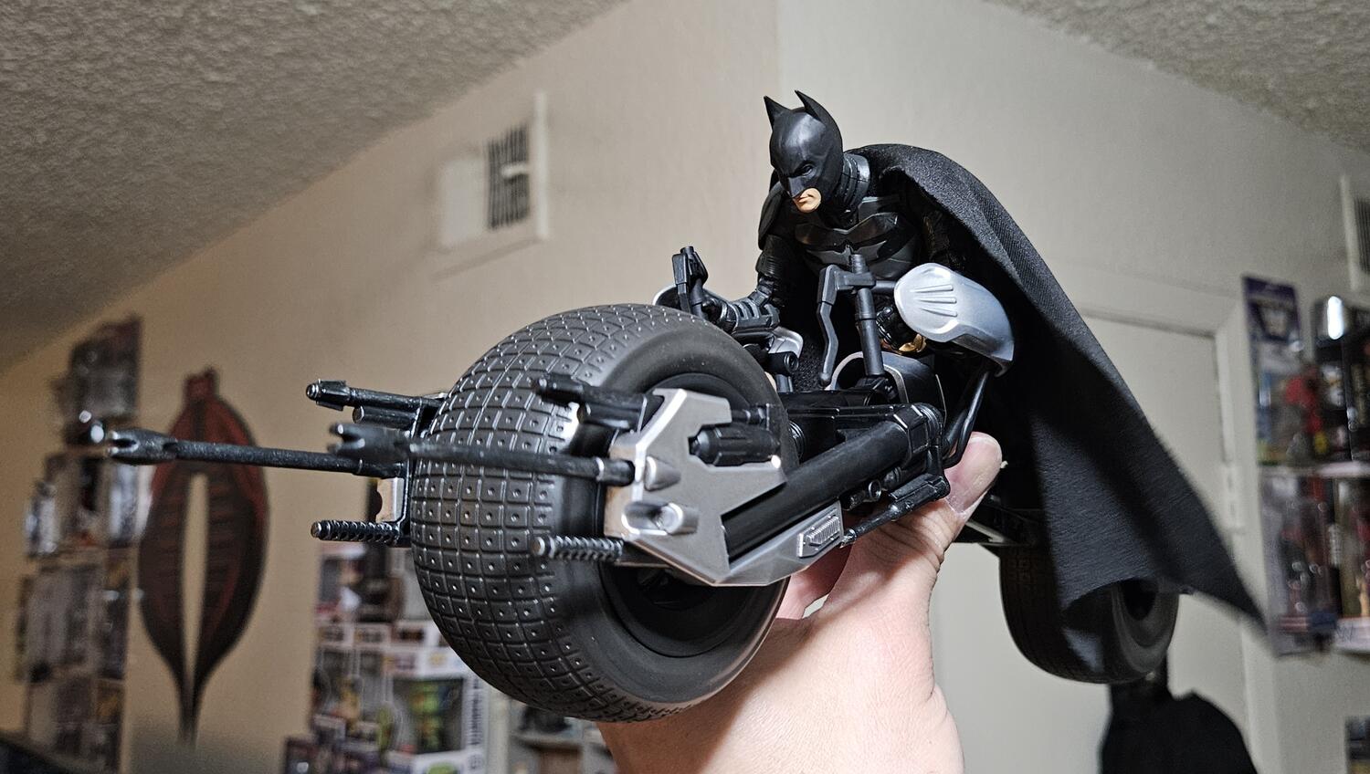 TDK Catwoman and the Batpod arrived today, and I was quite surprised by the Catwoman figure. Was completely not expecting the thigh/boot cut, and she sits nicely on the pod. If you have a previous Bale Batman figure, he too works with it, even if he doesn't have the proper hands to grip the handles.