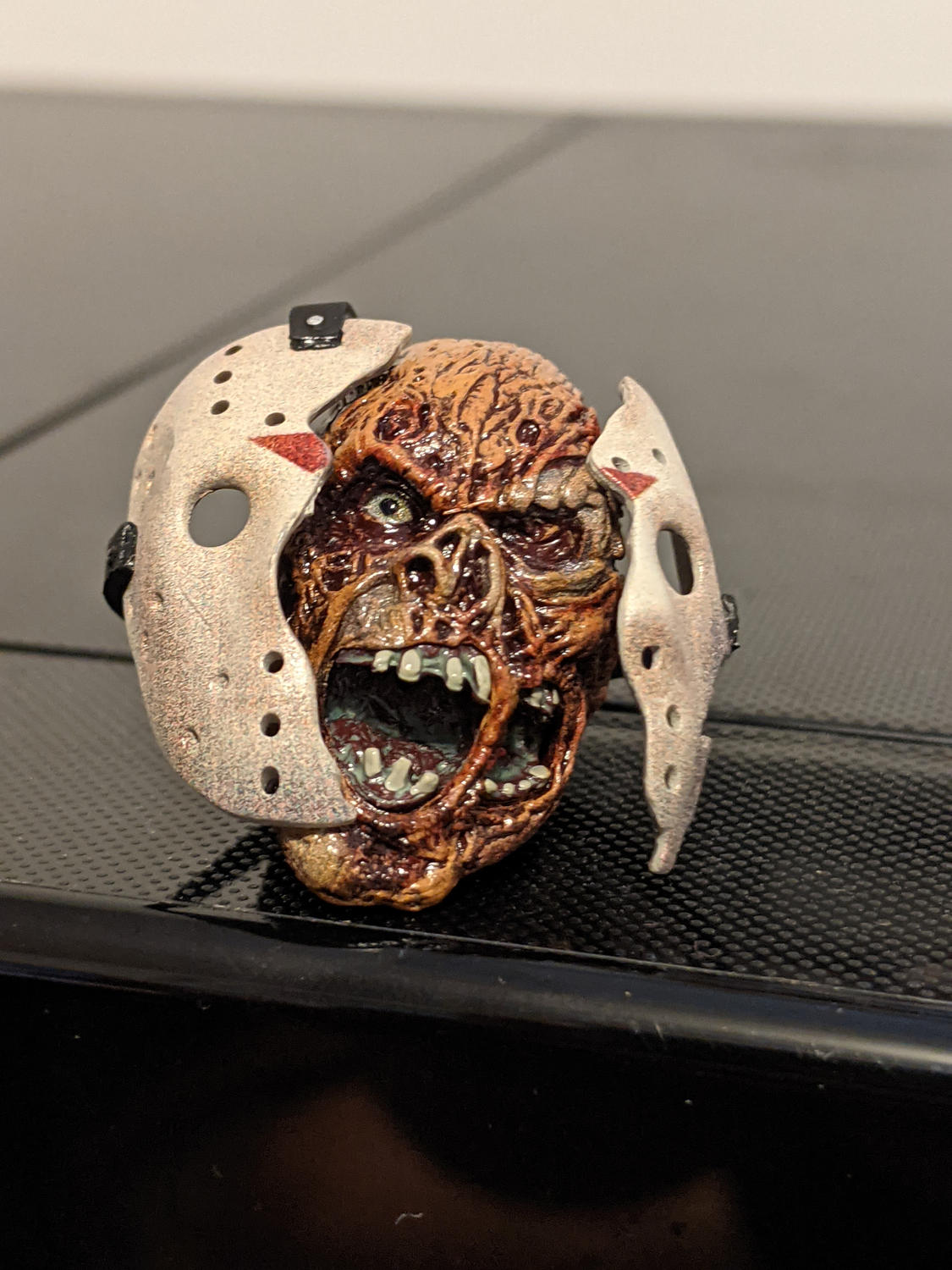 https://www.toyark.com/attachment.ph...1&d=1630089276 In case you were curious, here's the alternate head with the broken-open mask. There's a little peg on the strap that plugs into a hole on the back of Jason's head to keep it in place. https://www.toyark.com/attachment.ph...1&d=1630089357 |