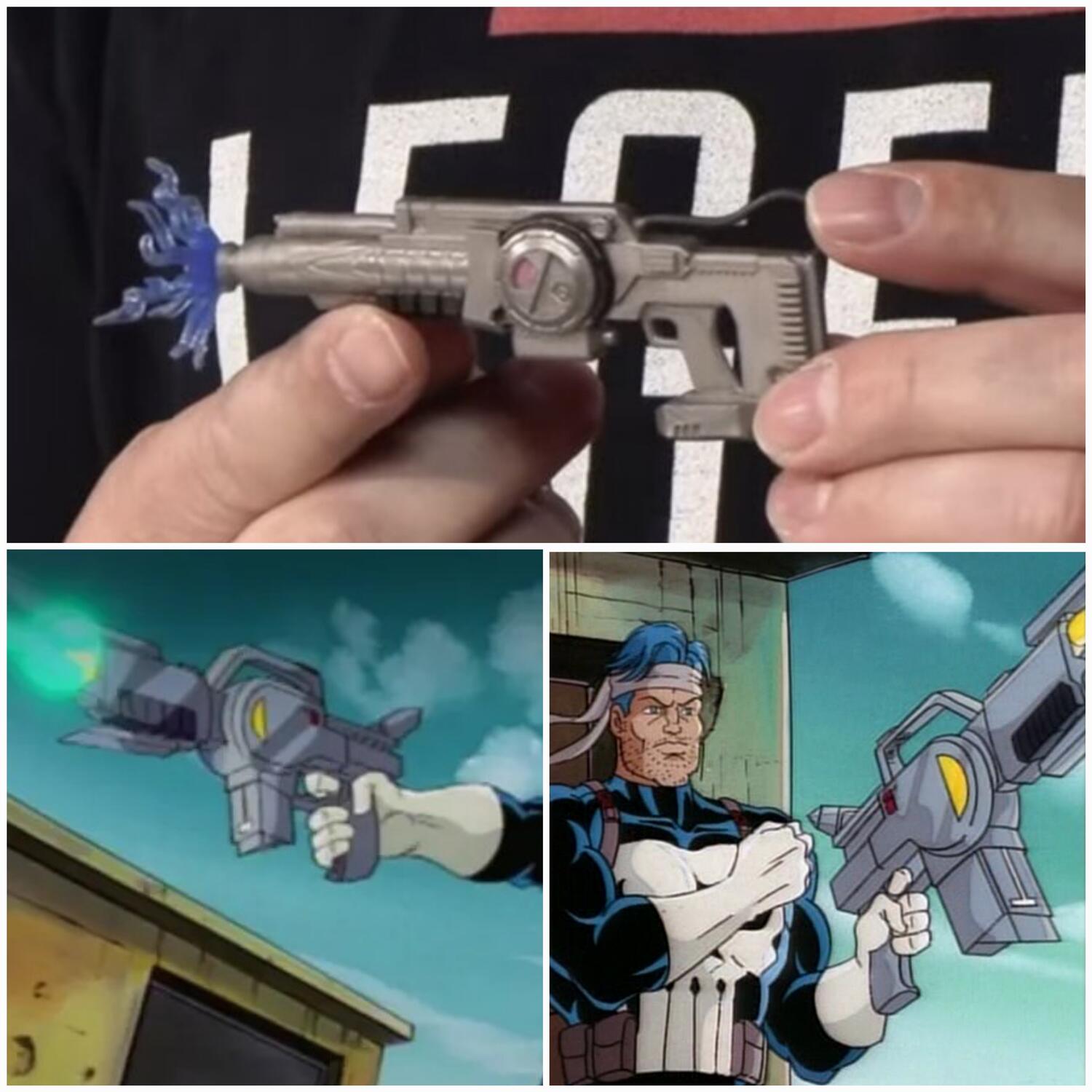While it's not identical...that weapon at the end has got me thinking there is an animated Punisher on the horizon. Hopefully it's for a blue/trenchcoat wearing Punisher for a Spider-Man box set, though this weapon looks like a modernized version of the one Frank was wielding in one of the Mojoverse episodes of the X-Men animated series...