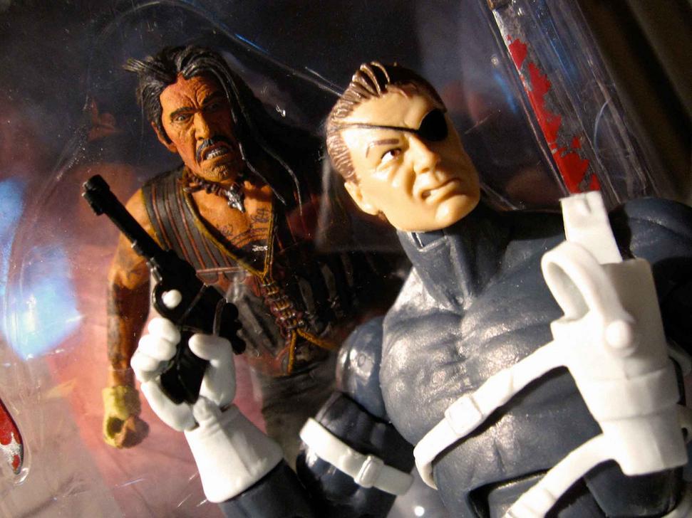 Just got me a Machete figure from NECA and the Marvel Legends Nick Fury 2-Pack (on clearance!) I had been eyeing the Fury figure for some time and it scanned up at $8 and change so I finally got him. Machete's detailing is beautiful. Almost no articulation, though. You can move his head and arms, but he's pretty much stuck in that pose. Fury, on the other hand has absolutely great articulation, but poor paint apps. Who would win in a fight? My money's on Fury all the way. Sorry Machete. At least you got to sleep with Michelle Rodriguez, Lindsey Lohan and Jessica Alba (F U for Alba. She's my #1). |