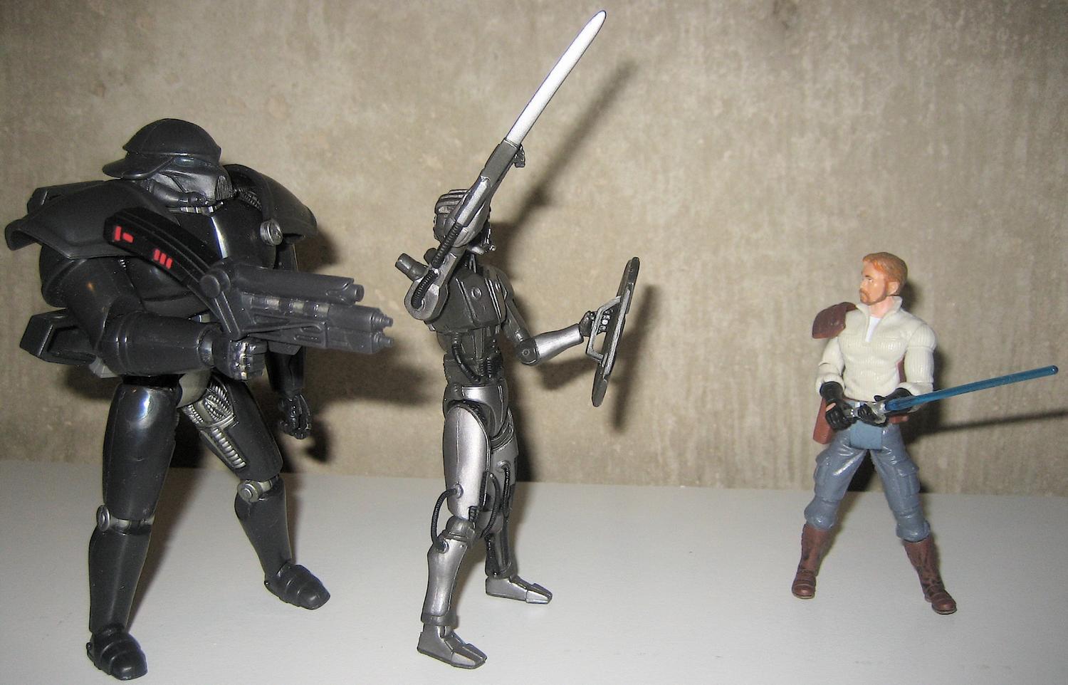 both the stormtrooper battle and the pilot briefing are really cool, who are the robots with kyle katarn?