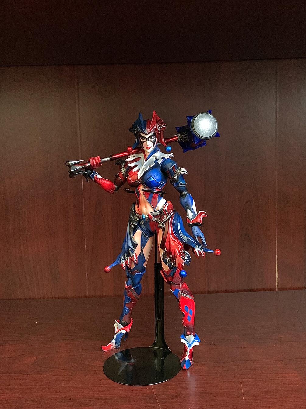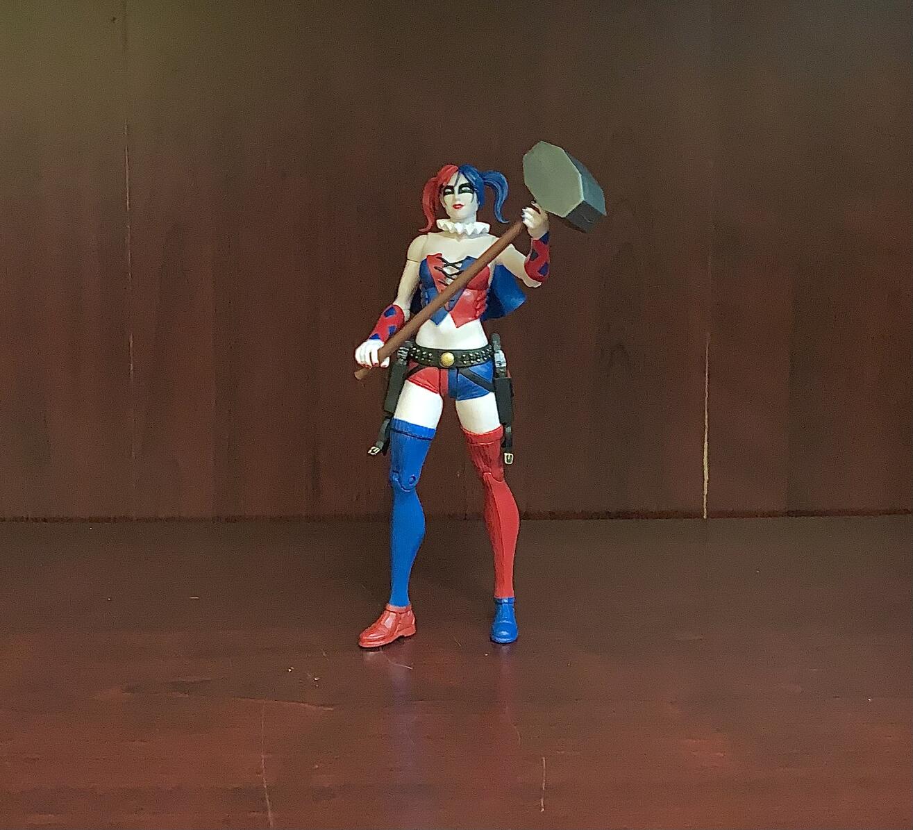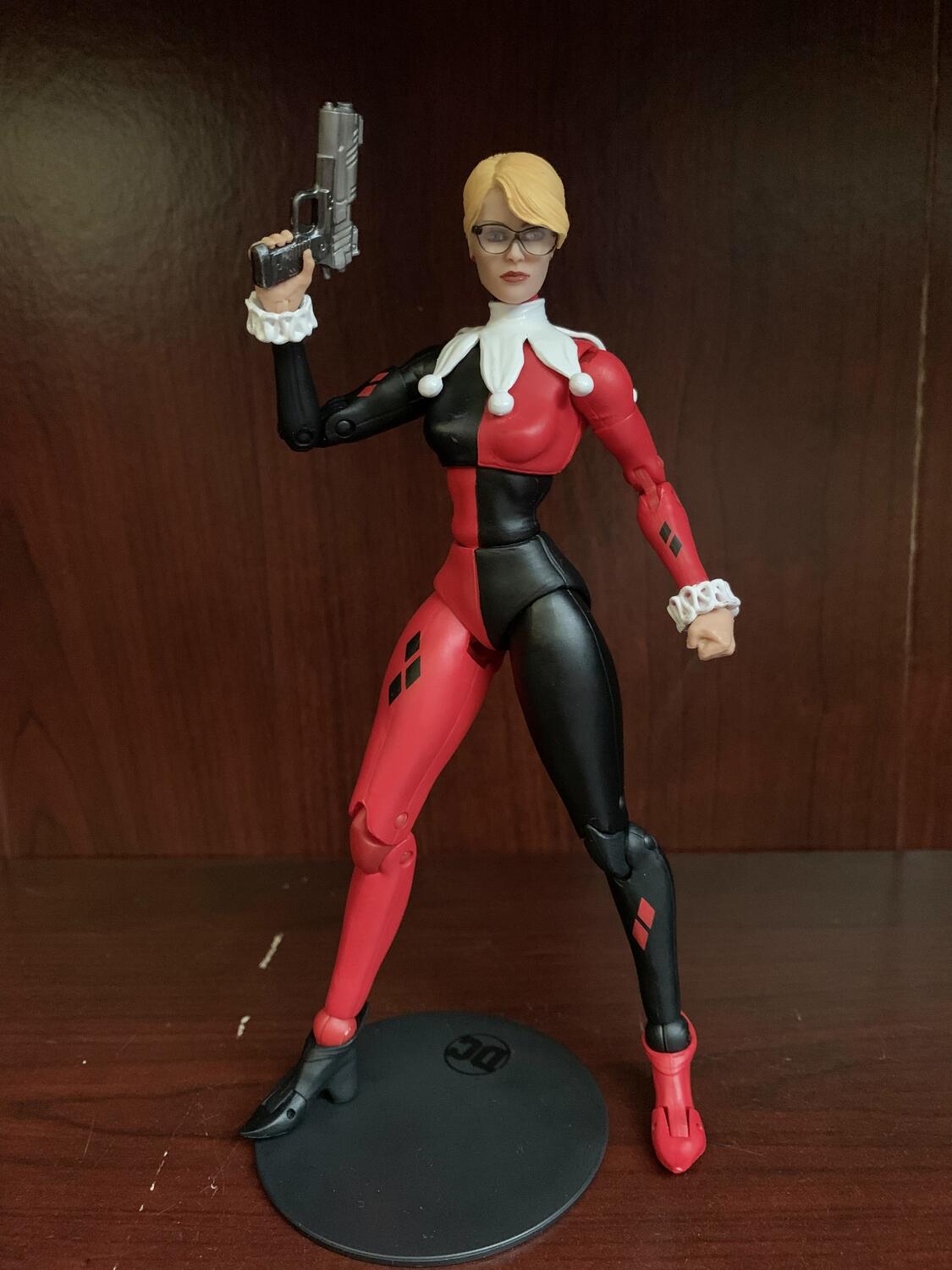 I really didn’t like the head that came with the mcfarlane Harley, so I did a little bit of swapping and made a unmasked Harley.