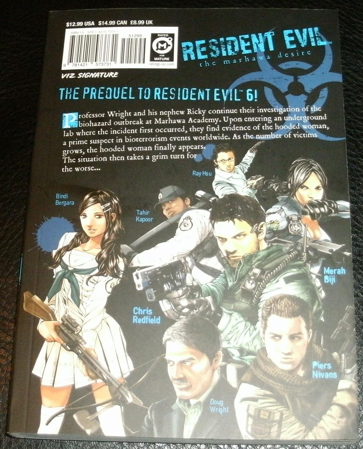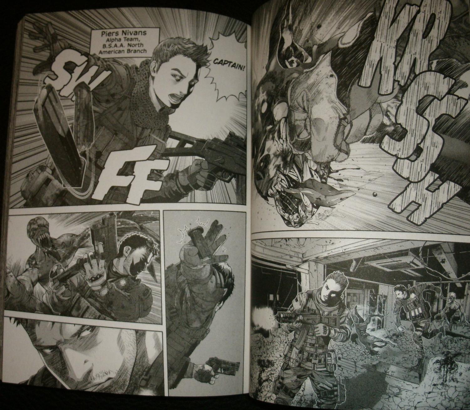 Happened across a Resident Evil manga that I never knew existed, called The Marhawa Desire. Not bad. It's as over the top as the last several games (one of the pages below has Chris "boulder punch" Redfield exploding a Cerberus hound's head with his fist) but it works in this format. This first volume is mostly setup of course, and the B.S.A.A. don't even arrive at the primary biohazard site, but it's good enough that I have the second volume ordered, and 3-5 pre-ordered.