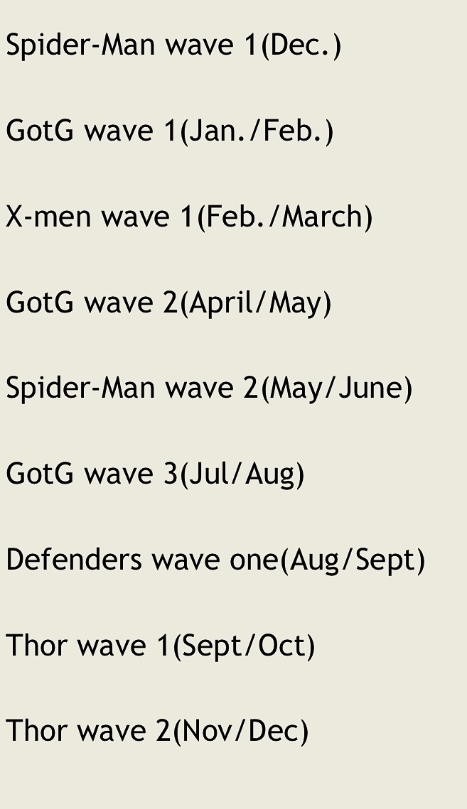 I'm not sure about GOTG getting three waves. The movie cast looks to be Star Lord, Gamora, Drax, Rocket, Baby Groot, Mantis, Yondu and Nebula. Add in a BAF and you have the whole second wave for the movie. The first wave looks to be a collection of comic book Guardians and cosmic characters. I still say we'll get a Fantastic Four wave year. They showed Sue at SDCC and she never comes without the rest of the FF. And since most of the Phase 3 MCU movies will introduce new characters, we won't be getting two waves per movie for the next couple of years except for Spiderman. That leaves more open spaces for comic book waves. |