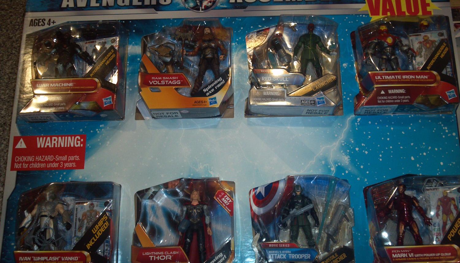 Looked around and didn't see this but I could be mistaken. I have found at a couple Walmarts here in Winchester VA, and understand in other parts of VA that have 8 packs of left over Thor, IM2 and Cap figures on a an 8 figure set. I am not sure the price but one of my friends told me they were about $25 which doesn't mean much but I saw three variants of sets. One had a bunch of junk on it, one had Destroyer on it and the last had Green Mandarin and Red Skull on it with a Hydra trooper. No I don't have pics but they are two rows of four and the card is about 2 1/2 ft long. It wasn't in the action figure section but more where the bulk large toys are.