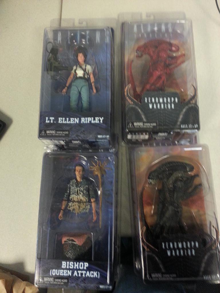 1. Man, NECA just can't nail that Sigourney Weaver likeness, can they? Plus it looks like Ripley is wearing an adult diaper. 2. I love "battle damaged" Bishop, and it's cool that they're making up for the fact that they're only selling you half a figure by including an egg/facehugger combo. Bishop better be coming with some milk like in NECA's pics, however! :) 3. Weren't these black and red aliens already released? |