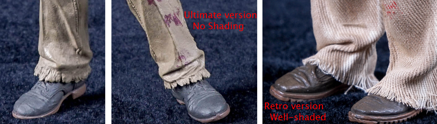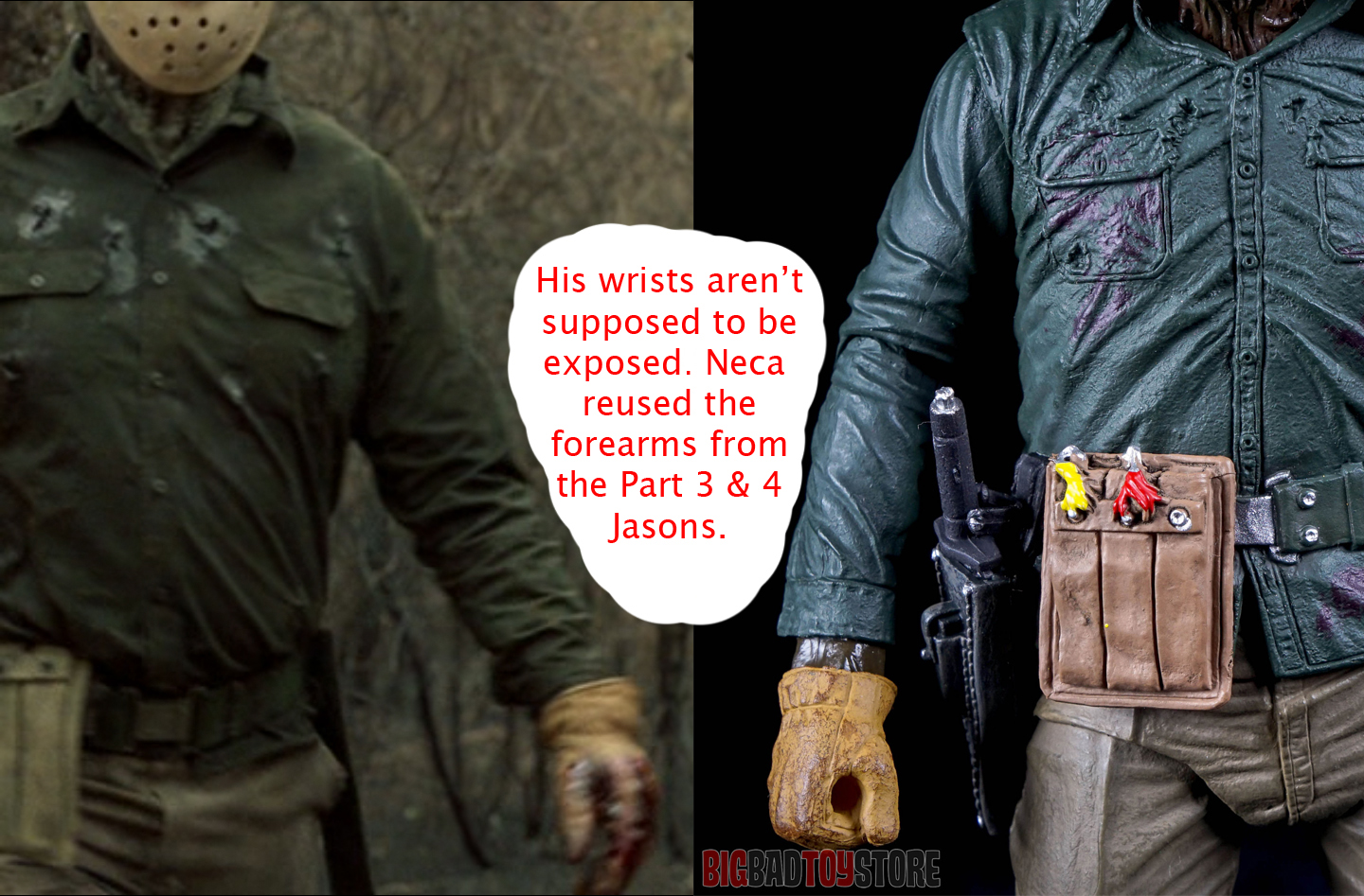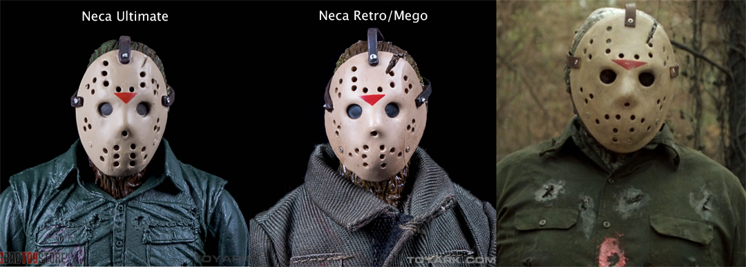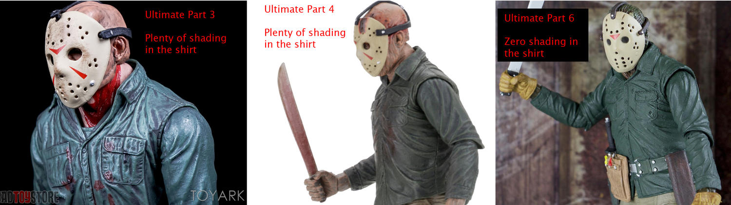Pull up a photo of their new Ultimate Part 4 Jason, or their Part 3 from last fall, or even the old Part 7 from years ago. Every one of those figures had masks that were almost spot-on screen accurate. The shape, the color, the highlighting, the eye holes, everything. This Part 6 figure's mask is not even close by any of those standards. Not even close to being close. As far as knit picking goes (not to be defensive), but I don't think that's warranted because as I mentioned in my initial post, Neca's own standards is to knit pick in the very same vain as I'm doing. A prime example is the fact that they put so much care into their Part 3 & 4 Jasons, that they even sculpted different upper arms for each figure to differentiate between his more hulking, muscular appearance from Part 3, and the more ordinary appearance in Part 4. If their own standards are to go that far with attention to detail, why not sculpt forearms with sleeves that go down to his gloves for this one? This Jason figure had a nice paint design in certain areas, but it had zero shading on the mask, shirt, pants, or shoes. Since all other Jasons (and most all other Neca figures in general), weren't neglected like that, it becomes beyond a matter of opinion that they didn't put as much effort into this figure as they do others. I think it's a shame. Compare the lack of quality that I highlighted in my post to the level of quality that went into their Ultimate Leatherface. The whole figure had its own unique tooling. Every piece was properly shaded (including all the weapons) to give him a gritty, realistic look and plenty of depth. That figure's a real work of art. I think when you stand this Part 6 Jason up next to others in the Neca horror line, it stands out like a sore thumb. |