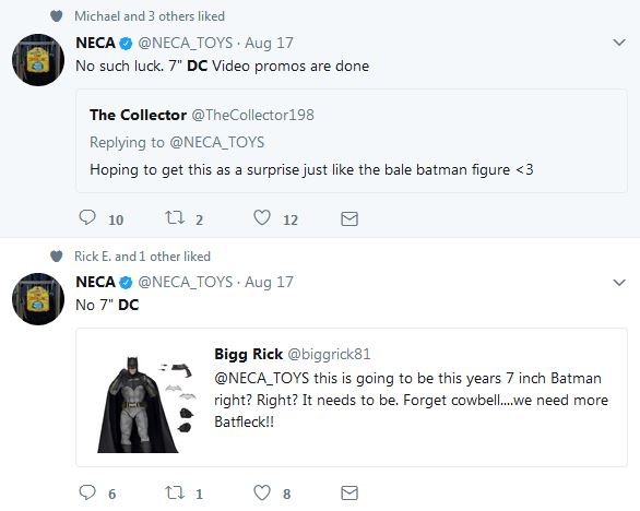We've seen this already with Hasbro and SH Figuarts Marvel items, which have to be sold at the $100 price point in North America. That is why the Bluefin editions always include additional items, so they can get the price in line. We've also seen it with NECA, who has to jump through hoops to do TMNT items and can then only sell them in the US. Also, the interest seemed very lackluster for the DC Movie items they revealed and the general price point. The market was (and still is) utterly saturated with 6 inch or so collector oriented Batman v Superman items and there's were coming way after. It just made no sense to start with those if they weren't going to be timed to hit retail when the movie was out. As far as more DC 7" figures from NECA, they've said that the stand alone releases are likely done. they are focusing on the Dark Horse and DC 2-Packs (which have been a licensing nightmare). |