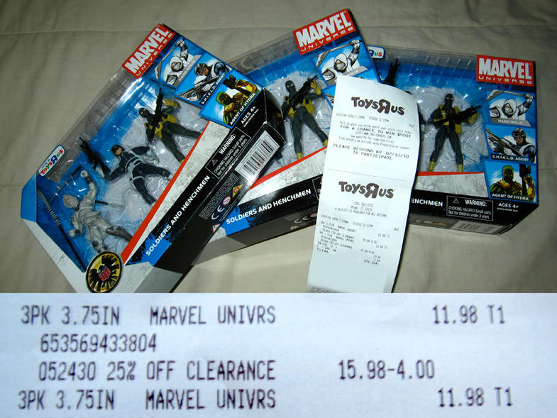 Just wanted to pass along the news. Looks like the MU 3-Packs with the Hand Ninja, Shield Agent and Hydra Agent are on clearance at TRU. I wasn't aware that the prices had dropped to $15.98. I picked one up today in store and decided to scan it just in case, and to my surprise it scanned for $11.98! Pretty awesome. The other 3-Pack (yellow Daredevil, stealth IM and Silver Surfer) scanned the normal $19.99.
