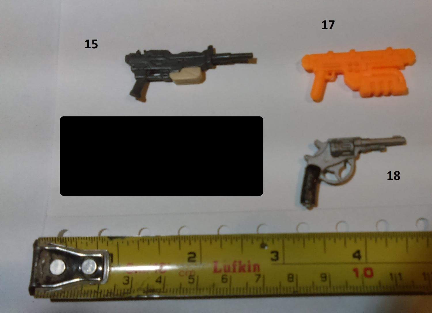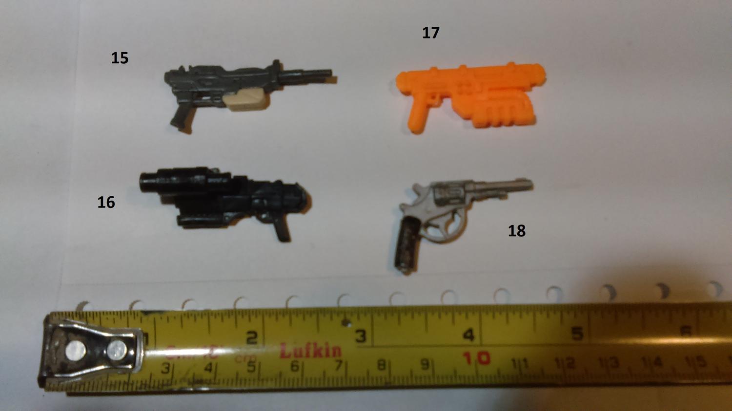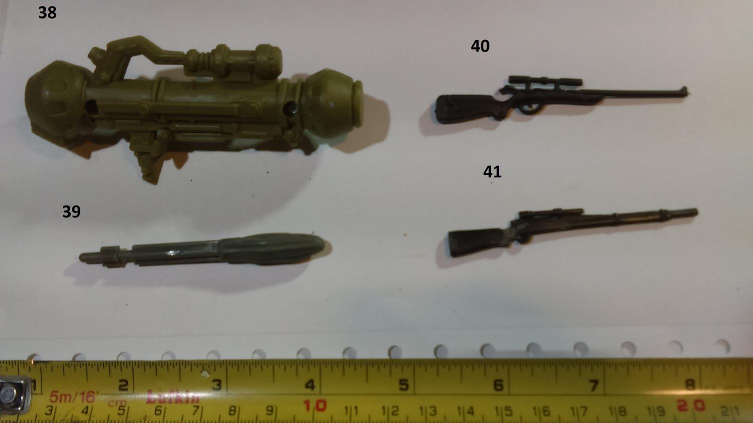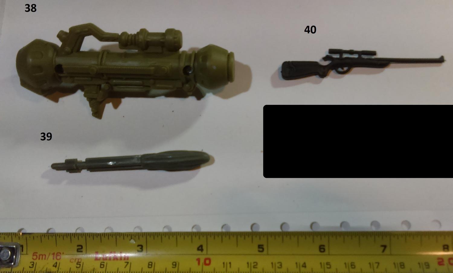 11. Star Wars Clone Wars 13. Lanard Corps Night Lazer 16. Hasbro Star Wars Scorch (or a later reuse of that weapon) 20 Lanard Corps John Eagle 38 Chap Mei Soldier Force 44. GI JOE Sharc 60. Corps Hammer 61. Corps Steve Wyoming 63. Commando Ranger or some other knock off. 64. Lanard Corps John Eagle 71. GI JOE HEadquarters 1992 86. GI JOE Cobra FANG 87. GI JOE Cobra Mamba |