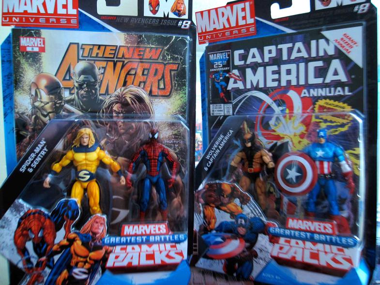 Hey all, just found the latest wave of the Marvel Universe comic packs, Greatest Battles, today at TRU. This wave includes Sentry/Spider-Man, Captain America/Wolverine, and Iron Man/Thor.