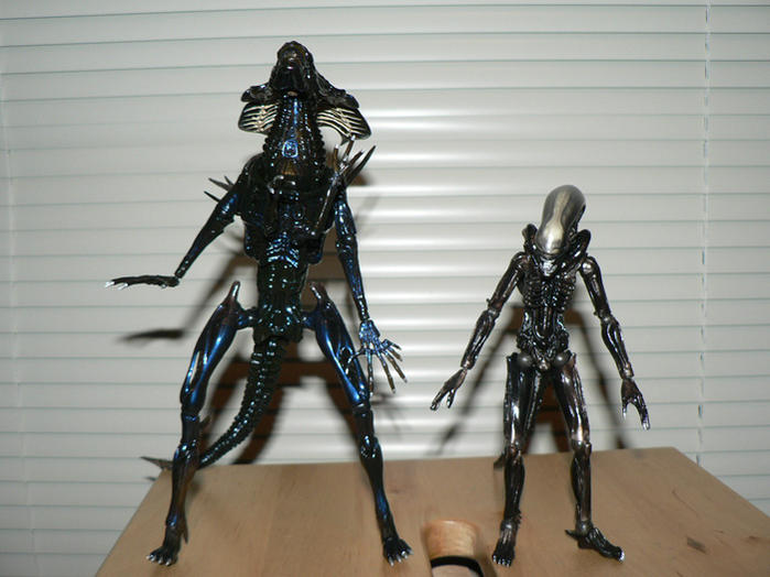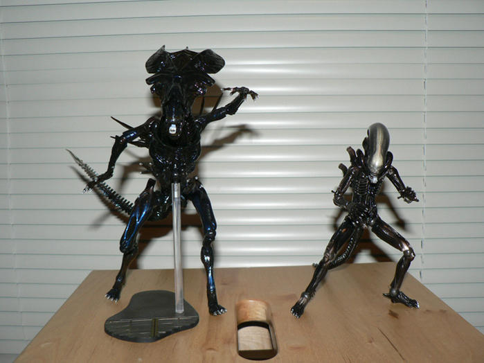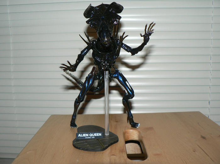 Attachment 4849Attachment 4850Attachment 4851 She comes with a stand and the standard Revoltech coin (not pictured). Not many accessories, but she really doesn't need any (though a few unopened pods would have been nice). The plastic looks black, but it's actually slightly see-through (sorry, camera sucks so I couldn't capture it here for you). Like the other Alien toys by Kaiyodo, the tail has a wire that allows it to be malleable and can be posed at the same time. Attachment 4852Attachment 4853Attachment 4854 There are about 25 revo joints, 26 if you include the one in the stand. The head and neck alone comprise of four joints. Attachment 4855Attachment 4856Attachment 4857Attachment 4858Attachment 4859 Here is a size comparison to the first Revoltech Alien. I haven't seen the Alien movies in a while, so I don't know if the scale is correct (something tells me it's not quite exact). Regardless if the scale is correct or not, chances are it won't deter from the fun factor. Attachment 4860 And here's a final one where they're as tall as possible. Attachment 4861 Overall, a really nice toy that looks great on the shelf. I can't wait until the Predator is released. Edit: The queen can stand on her own, but you have to leave the tail on the ground. Otherwise, you have to use the stand provided. |