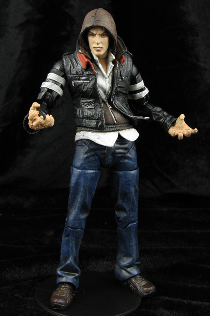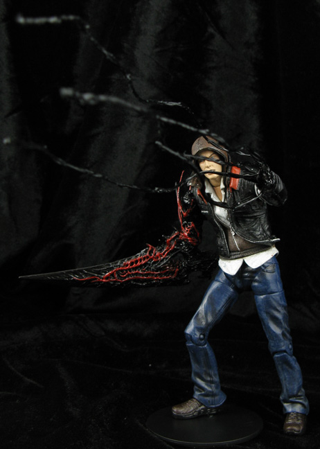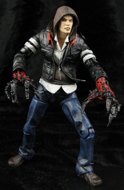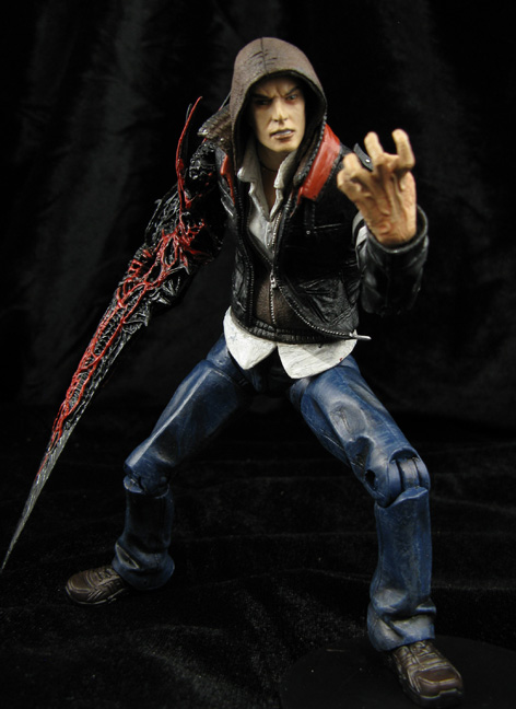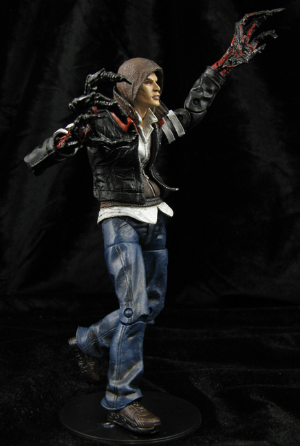 NECA's Alex Mercer figure looks cool but lacks decent arm and leg articulation. I was able to fix that problem by using the lower body of a Heroes 'exploding Peter' and modding it to fit the waist ball joint. Alex's arms were replaced with Marvel legends movie Nick Fury's jacket arms and new hands given. One set came from an Alien Spawn, the other set a Tortured Soul figure. His original left hand was modded with Plasti-dip covered wires running from the fingers so he could infect his enemies. The arms pop off so you can attach his giant arm blade. One full paint job later including the red tendril effects iconic to the game and this Alex was fully poseable and deadly!