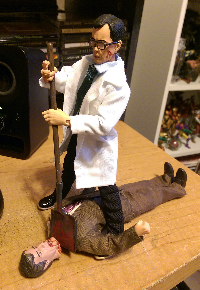 I agree that this release is pretty much perfect, aside from the paintwork on Herbert's head, the quality of which varies wildly from figure to figure. It's not at the level of NECA's typical Mego-style releases, but if you look long and hard (like I did) you can find some that are MUCH better than others. Question, Joe...I know you've said this previously, but where is that desk in your photo shoot from again? Was it from a Gotham figure? Also: if you want a fun prop for a Re-Animator dio, go on ebay and buy one of the Anchorman Mego-style figures (they're in the same scale as the NECA stuff). You can get one for, like, $9.99 + free shipping. They all come wearing business suits (Brick Tamland's works best). Just remove the head and you have a perfect body to use to re-create the death of that filthy plagiarist, Dr. Hill: