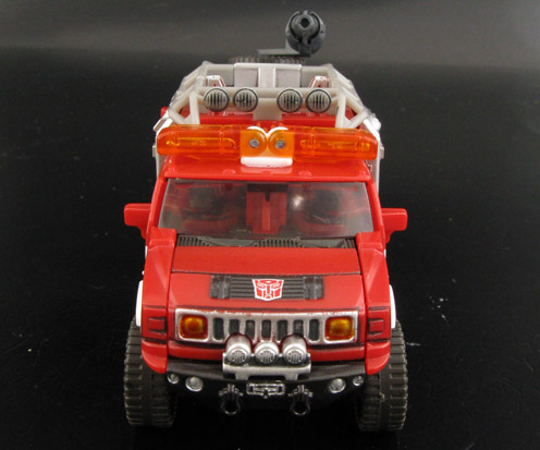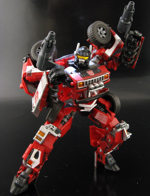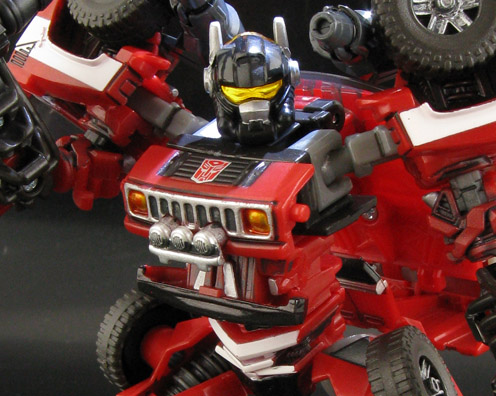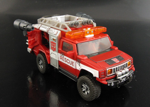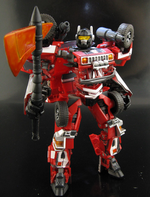 Props to Shinobitron for doing this headswap first. Smoulder's head on Rescue Ratchet was a great idea! I took it a step further after seeing Playschool's new Rescue Bots Heatwave and wanted a fire/rescue vehicle but in regular TF style. I constructed some shoulder cannons from various parts and a blazing axe from a DCU weapon. An extended light bar came from movie Longarm. The knees were modded to allow him to stand straight up, shoulders panels modded to fold all the way in, and bumper that now swings down and locks the chest in place. Now Heatwave is ready to roll!