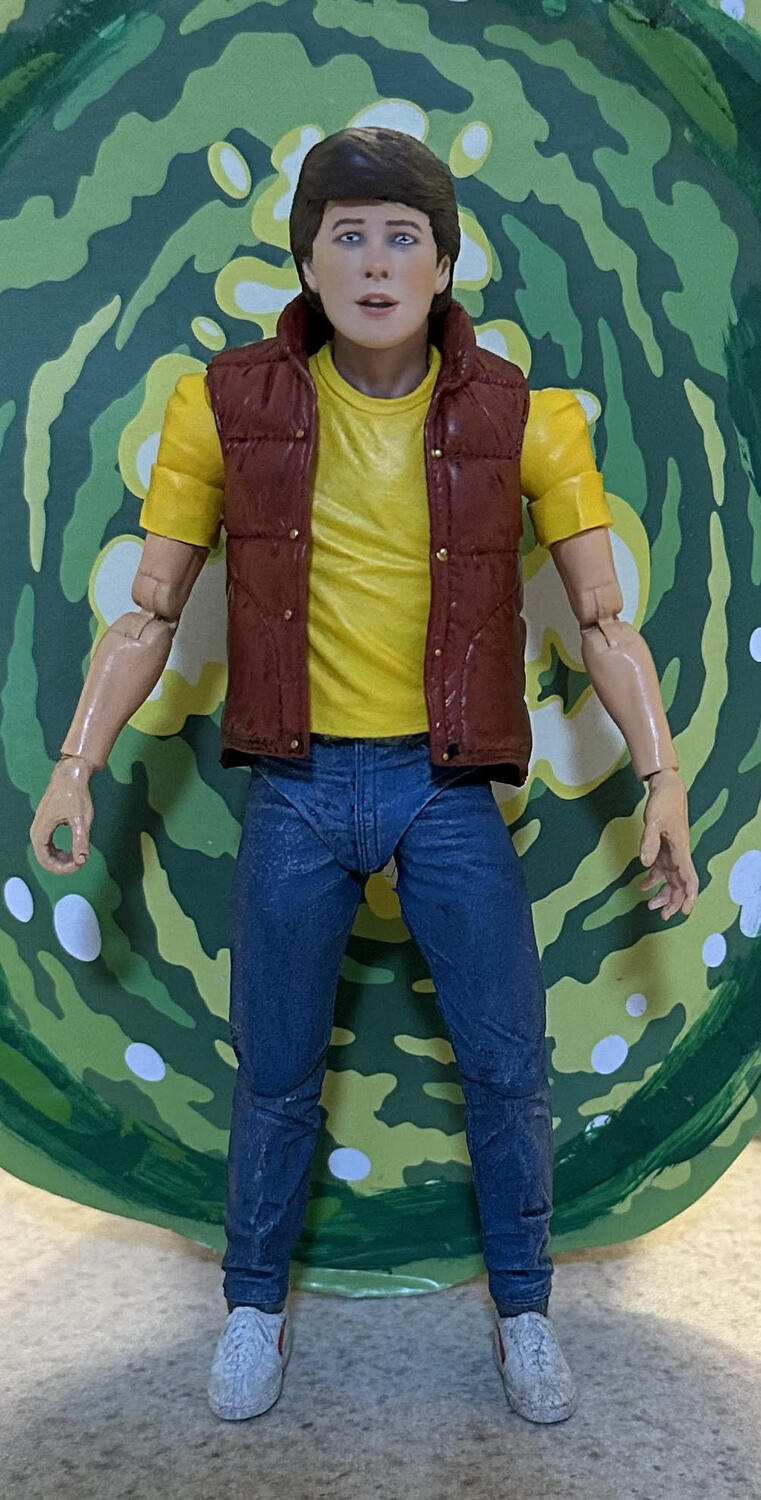 Complete repaint of the face. Sculpted hair wedges. Carved 1 wedge out of each side of the bottom original hair to spike it more. Head - NECA Doc Brown Alt head Torso/Coat - ML Reed Richards Lower - ML Morlun Morty was done using NECA Marty with eye repaint and filled in hair part. Combined 2 NECA Marty to make the body and used ML Reed Richards for sleeve tops and Elektra arms. The alt Rick animated head I painted the eyelids on. |