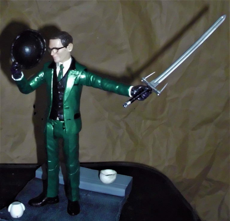 Peck’s blazer is open to reveal the vest underneath, so I went with The Riddler’s third season costume. It would’ve been harder to make his season four look since it’s double breasted. I did raise the lapels upward for more screen accuracy. It tends to look very different depending on the scene’s lighting, but it often has a sheen to it. Cory Michael Smith described the suit as bright sparkly green, so I went with metallic Christmas green paint. The hat was made from a domed piece of vinyl with a braided ring in the center left over from a model kit. The braid was excised & the remaining halves glued together. The seam was spackled over. The brim was cut from cardboard & the hatband from from paper. The gun is borrowed from The Spirit’s Sand Saref. It’s probably the wrong make but it fits his hand well. Now I need an another one for her. His definitely inaccurate sword is from the SG-1 Lieutenant Colonel Cameron Mitchell.