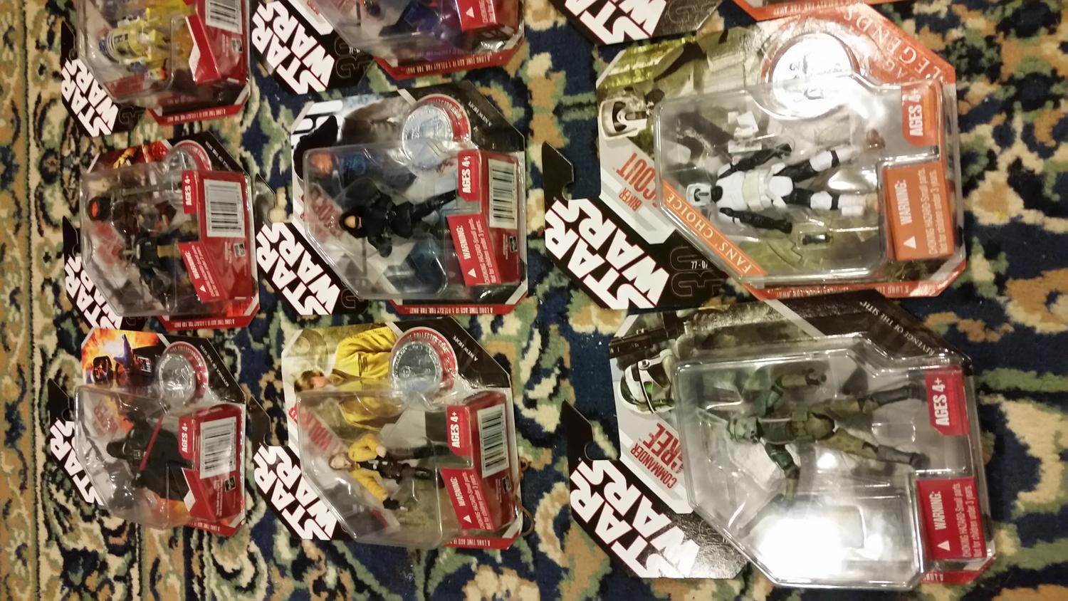 2. Price: $120.00 plus shipping: A set of (5) Star Wars Battle Packs and Evolutions packs made by Hasbro around 2008-2009 These figures and packs have never been opened and are still sealed on their cards, which may have small signs of common wear but no major damage (see photos). Some have been kept in plastic protective packaging, not included. They have been in a smoke free home. I have used a very reputable pricing guide as a basis for comparison, and considering some comic stores would charge much more, this is a great deal for someone with more room! Note: I do not ship outside the contiguous 48 United States, and I only accept PayPal. PM me for offers and details. Good luck, and may the Force be with you.... ---------------------------------------------------- 30th Anniversary figures: 30-01: Darth Vader (coin album not included) 30-03: Mustafar Lava Miner 30-04: R2-D2 30-05: Obi-Wan Kenobi 30-06: Mace Windu 30-08: Super Battle Droid 30-11: Han Solo (Smuggler) 30-12: Luke Skywalker (Yavin Ceremony) 30-13: Death Star Trooper 30-14: Biggs Darklighter (Rebel Pilot) 30-16: Darth Vader 30-18: Luke Skywalker (Moisture Farmer) 30-20: Imperial Stormtrooper (Galactic Empire) Saga Legends: Battle Droids 2-pack I (tan infantry & commander) 2008 Revenge of the Sith - Commander Gree (2) Saga Legends Fan's Choice 2007: Biker Scout (two figures) Also included, four very cool Force Unleashed figures from 2008: (2) 08-09: Imperial EVO Trooper (two figures) (2) 08-10: Imperial Jumptrooper (two figures) ---------------------------------------------------- Battle Packs: Battle Pack: Shield Generator Assault Battle Pack: Hoth Speeder Bike Patrol Evolutions: Imperial Pilot Legacy Evolutions: Vader's Secret Apprentice Evolutions: Clone Trooper to Stormtrooper |