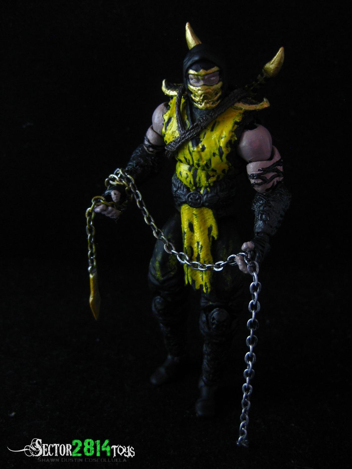 Took a break from making DC characters so I decided to finish my custom Scorpion lying around the work area. Hanzo's design is heavily based on the concept of Vincent Prose. I really liked how he explained that the yellow on the costume comes from the Demon's blood that had resurrected Scorpion. I tweaked the design a little bit by mixing his MK9 shoulder pads, mask and swords with the design. He was coated with flat black and painted a shade of gun metal on his armored parts. His skin was also purposely painted to look pale because he is of the undead. I also followed the concept wherein his skin on the elbow part looks like it is peeling off. A lot of sculpt went into this one and I also included a custom non-articulated Bi-Han/Elder Sub-Zero/Noob Saibot to show how he was killed by Scorpion. Fatality!