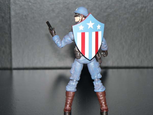 The breakdown: Captain America is designed in his WWII costume. He comes with a removable helmet and webgear (though I didn't try to remove it since it seemed the seams were glued together), a gun and his trademark shield, which comes with elastics like the first MU Captain America release, thus allowing you to place the shield on his back. The sculpt itself is amazing, but the real beauty is in the architecture of the figure. Cap comes with all new articulation. He has the standard shoulder, elbow, wrist, swivel torso, double jointed knees, swivel biceps, swivel legs just below the knees, and he sports the Wolverine Origins style ball jointed hips. What sets him apart are the wrists, which sport the Clone Wars style pegs that allow the wrist to not only swivel, but position at various angles to hold guns. And if you notice, the joint for the neck is different as well. The ball jointed peg actually moves forward and backwards, allowing the figure to look up and down! Finally, the ankle has new articulation as well. Instead of just allowing the foot to move the traditional up and down, the ankle joint is a peg. You can't see it very well here, but the peg is on a 45 degree angle from the bottom of the leg. This allows the foot to be moved side to side for better poses! Overall, this is a FANTASTIC figure. The articulation blows anything else at this scale out of the water. Hasbro really outdid themselves this time!