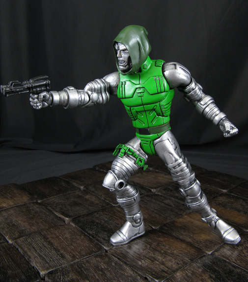 All hail DOOM! The tyrant has arrived in all his un-caped glory with this Secret Wars Dr Doom custom Marvel Legends figures based upon his comic book/vintage toy appearance. He was created using a DC Universe Sportsmaster upper body, Cyborg limbs and waist, and custom cast Dr Doom head. All his armor parts were sculpted on and I created a double-barreled ray gun for him like the original had. He also gets a beam-blast to take down his enemies. Sorry but there's no lenticular shield this time! Doctor Doom was painted using Testors Model Master Acrylic, Formula P3, and Citadel metallics.