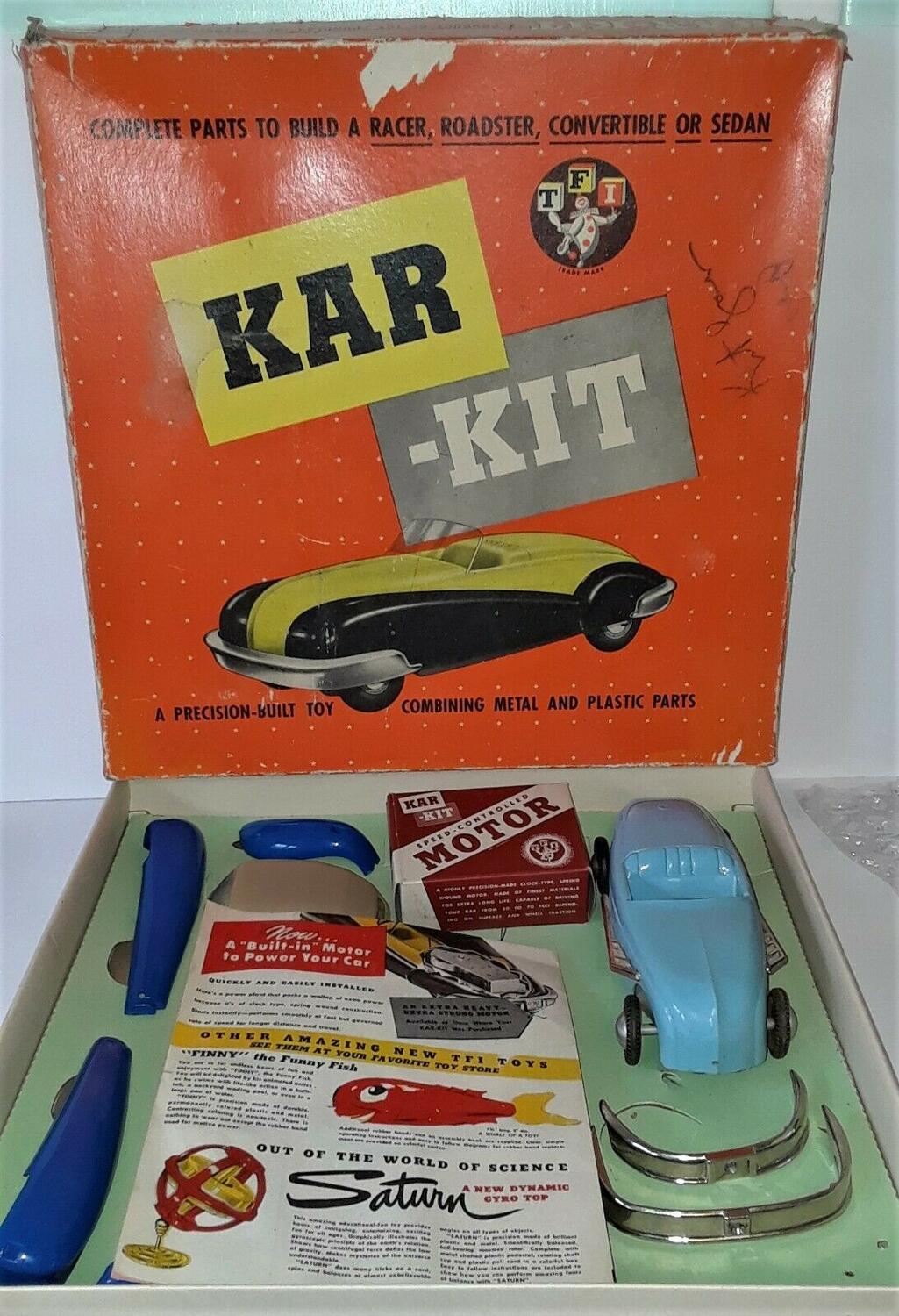 Rare 1940's Toy Founders Inc. Kar-Kit Art Deco Windup Model Kit, made in Detroit from 1945 to 47. I believe the kit is complete, inc. the motor. You could build several different vehicles out of the kit, which is why it came with a variety of different parts. Live Auctioneers estimated that the set is worth $750.00 in 2014. I would consider this is a higher end quality set.