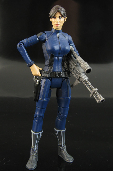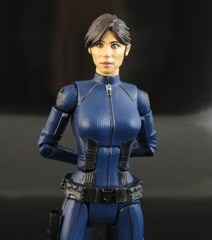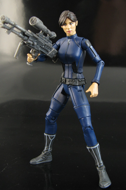 SHIELD Commander Maria Hill joins the roster of Avengers movie figures that needed to be made. Along with Coulson she was part of the action and here we have here in the movie styled uniform. Hill was made from a The Dark Knight Rises Movie Masters Catwoman body, DC Universe Zatanna hands, Marvel Legends Black Widow 2-pack head, and Fantastic Four movie figure boots. A hip holster and pistol was added along with a nifty giant rifle I found. I sculpted her hair bun, changed her bangs up, added some suit detailing, and the rest just fell into place. She even has little SHIELD logos on her shoulders. Now Maria Hill is ready to command the Helicarrier into battle!